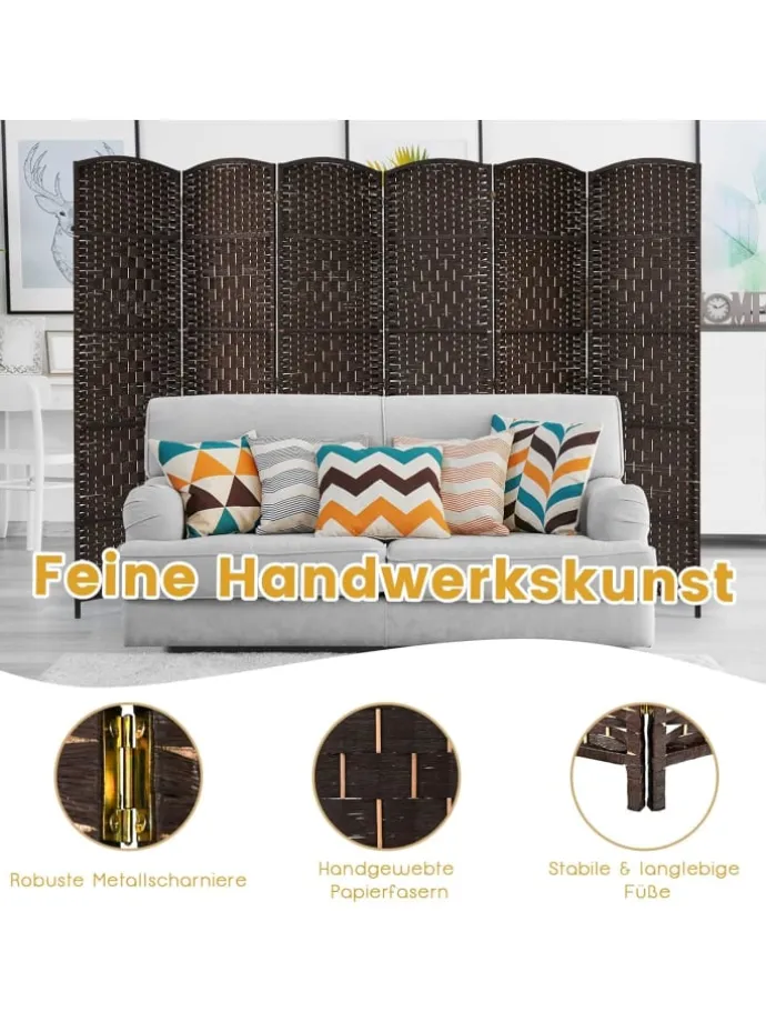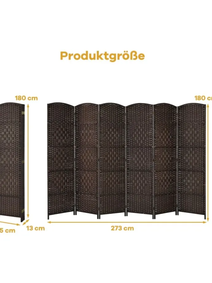Der 6-teilige Raumteiler bietet nicht nur ein elegantes handgewebtes Muster und eine geschwungene Silhouette, sondern verfügt auch über einen stabilen Massivholzrahmen für Standfestigkeit und Langlebigkeit. Mit dem 180°-Drehgelenk lässt der Raumtrenner sich leicht verstellen und ist die perfekte Lösung für Privatsphäre und Raumaufteilung – dabei ist er leicht und einfach zu verstauen. Ob im Wohnzimmer, Schlafzimmer oder Büro, dieser vielseitige Sichtschutz fügt sich harmonisch in jede Einrichtung ein und verbindet Praktikabilität mit ästhetischem Reiz. Ideal für moderne und traditionelle Einrichtungen hilft dieser Raumteiler, Ihren Raum mühelos zu strukturieren und neu zu definieren.