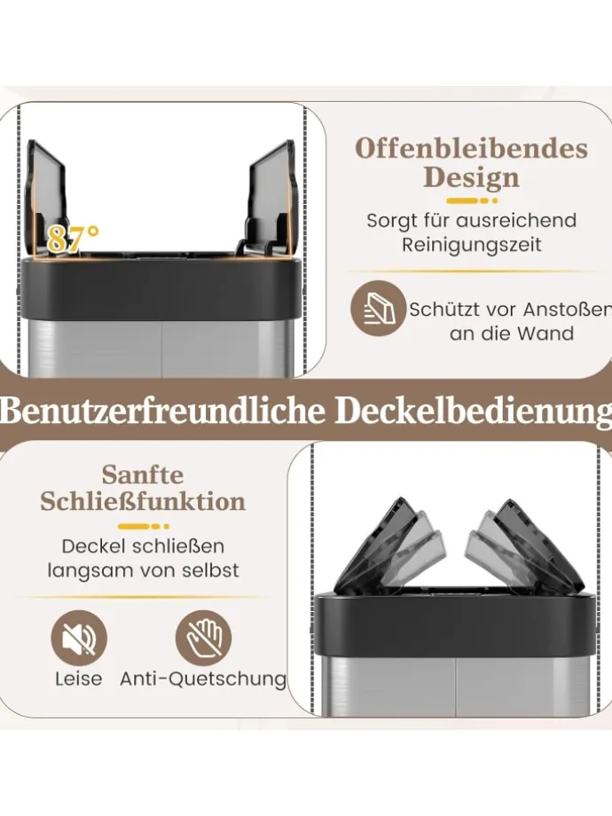 Erleben Sie mühelose Müllentsorgung mit diesem intelligenten Mülleimer mit Bewegungssensor, der Bewegungen in 15 bis 25 cm Entfernung in nur 0,3 Sekunden erkennt. Nach dem Öffnen schließt sich der Deckel automatisch nach 5 Sekunden und hält Ihre Umgebung sauber. Mit einem 87° Offenhaltewinkel schützt er vor Wandberührungen, während der geräuscharme, anti-einklemm Schutz für sanftes und sicheres Schließen sorgt. Hergestellt aus robustem, 3-lagigem Edelstahl ist dieser Mülleimer rostfrei, fleckenresistent und hält Gerüche effektiv im Inneren. Mit schützenden Fußpolstern und einem Beutelhalter kombiniert dieser platzsparende Behälter praktische Funktionalität mit Komfort für den täglichen Gebrauch.