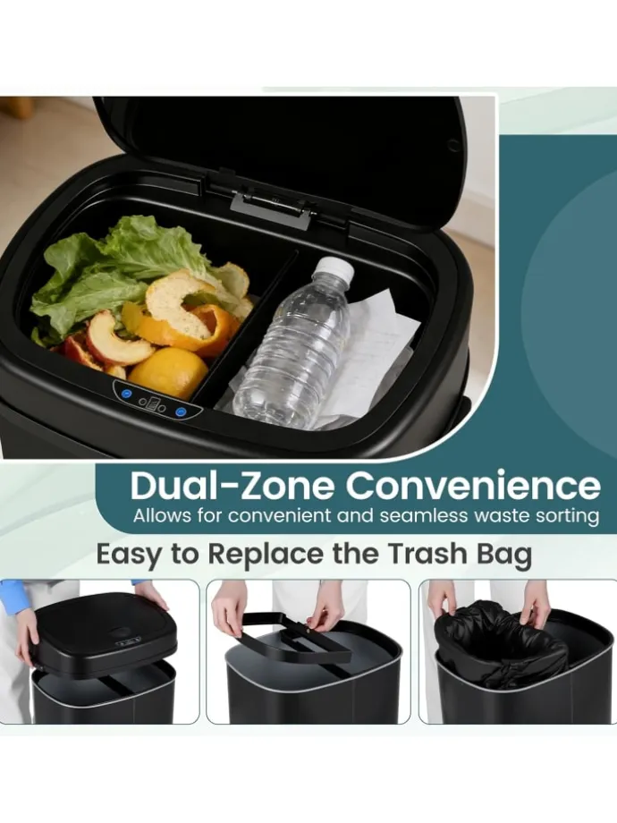 Dieser innovative Mülleimer bietet duale Zonen für Müll und Recyclingmaterialien, wodurch das Sortieren mühelos wird und Ihr Zuhause organisiert bleibt. Ausgestattet mit einem empfindlichen Infrarotsensor mit 15 cm Erfassungsbereich reagiert der Deckel bei erkannter Bewegung in 0,3 Sekunden und schließt automatisch nach 5 Sekunden, um unangenehme Gerüche effektiv einzuschließen. Mit großzügigem 68L Fassungsvermögen und einem langlebigen, fingerabdruckresistenten Metallrahmen ist dieser Abfalleimer leicht zu pflegen. Seitengriffe ermöglichen eine einfache Mobilität, während Schutzfüße den Boden schützen.