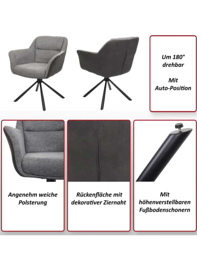 – Nicht nur elegant und modern, sondern ebenso funktional: Durch die Auto-Position ist der Küchenstuhl um bis zu 180° drehbar und dreht automatisch wieder in die Ausgangsposition zurück. Bei diesem Polsterstuhl bleiben keine Wünsche offen.