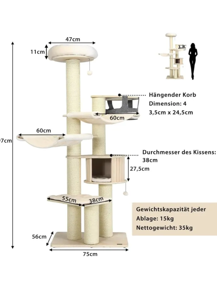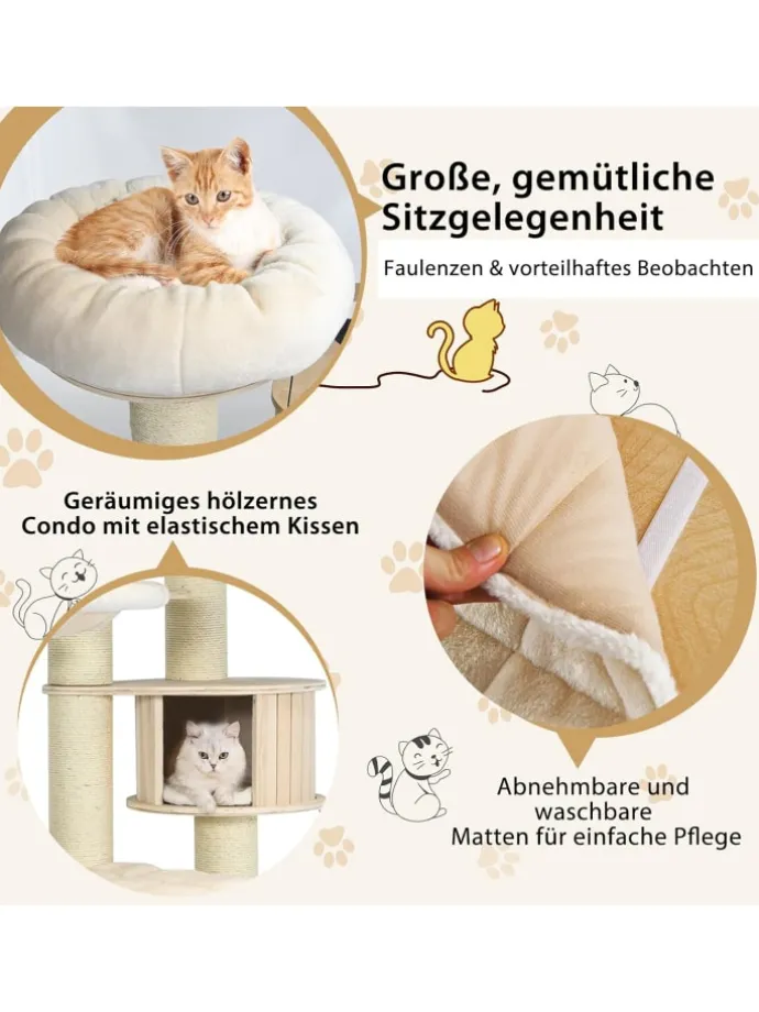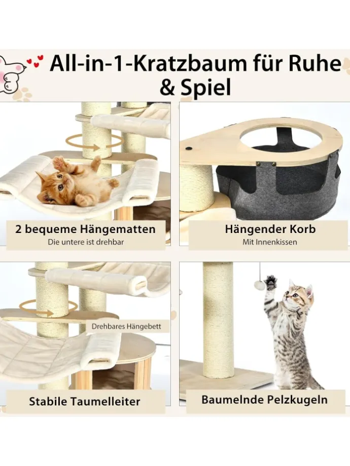 Wenn Sie auf der Suche nach einem gemütlichen Kratzbaum sind, ist unser mehrschichtiger Kratzbaum definitiv eine gute Wahl! Unser Mehrzweck-Kratzbaum kann fast alle Bedürfnisse Ihrer Katzen befriedigen: vom oberen Sitz aus den Bereich überblicken, in der Hängematte ausruhen, in der Höhle faul liegen und auf der Plattform spazieren gehen. Außerdem sind die gesamten Pfosten mit viel Sisal umwickelt, sodass Kätzchen ihre Krallen daran statt an den Möbeln wetzen können. Mit den lustigen Flauschbällen kommt bei Katzen keine Langeweile auf. Dieses Katzen-Aktivitätszentrum ist mit weichem, hautfreundlichem Plüsch bedeckt und sorgt dafür, dass Ihre Katzen es immer warm und gemütlich haben. Darüber hinaus können Sie den Plüsch dank der Klettverschlüsse ganz einfach abnehmen, um die Pflege zu erleichtern.