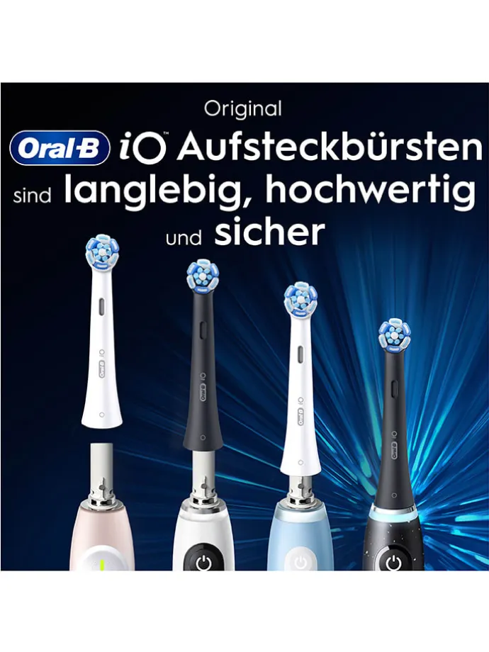 – die iO Technologie kombiniert den einzigartigen, runden Bürstenkopf mit sanften Mikrovibrationen der iO Zahnbürste für die beste Reinigungsleistung von Oral-B