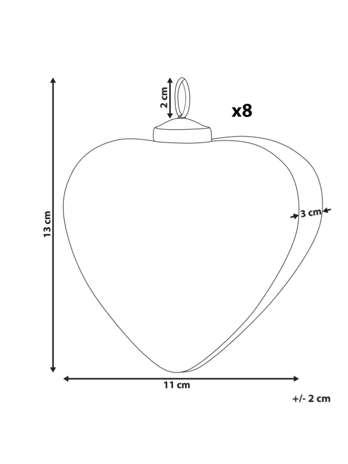 8 handgefertigte Glaskugeln in Herzform für den Weihnachtsbaum. Verleihen Sie Ihrem Weihnachtsbaum einen liebevollen Touch mit unserem herzförmigen Baumschmuck. Diese Glaskugeln sind mit Präzision handgefertigt und verfügen über eine strukturierte Oberfläche sowie eine edle Antik-Optik, die ihnen einen angesagten Vintage-Look verleiht. Um Ihnen den Gebrauch zu erleichtern, sind die Christbaumkugeln mit festsitzenden Käppchen versehen.