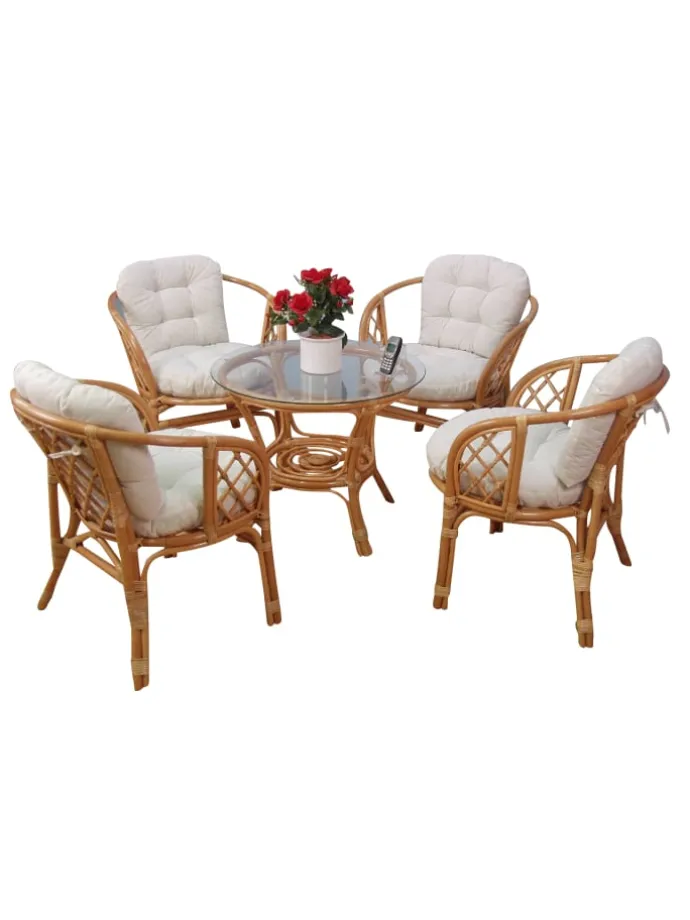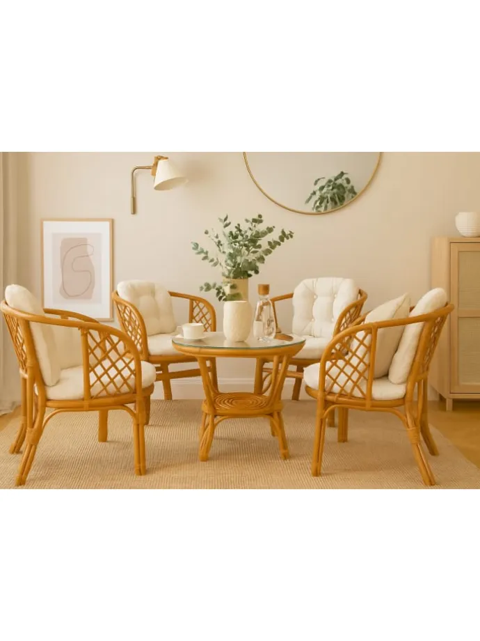 Diese hochwertige, moderne Rattan Sitzgruppe überzeugt durch ihr stilvolles Design und natürliche Eleganz. Das 5-teilige Rattanmöbel Set besteht aus vier bequemen Sesseln und einem runden Glastisch – perfekt geeignet für Wintergarten oder Lounge-Bereich.