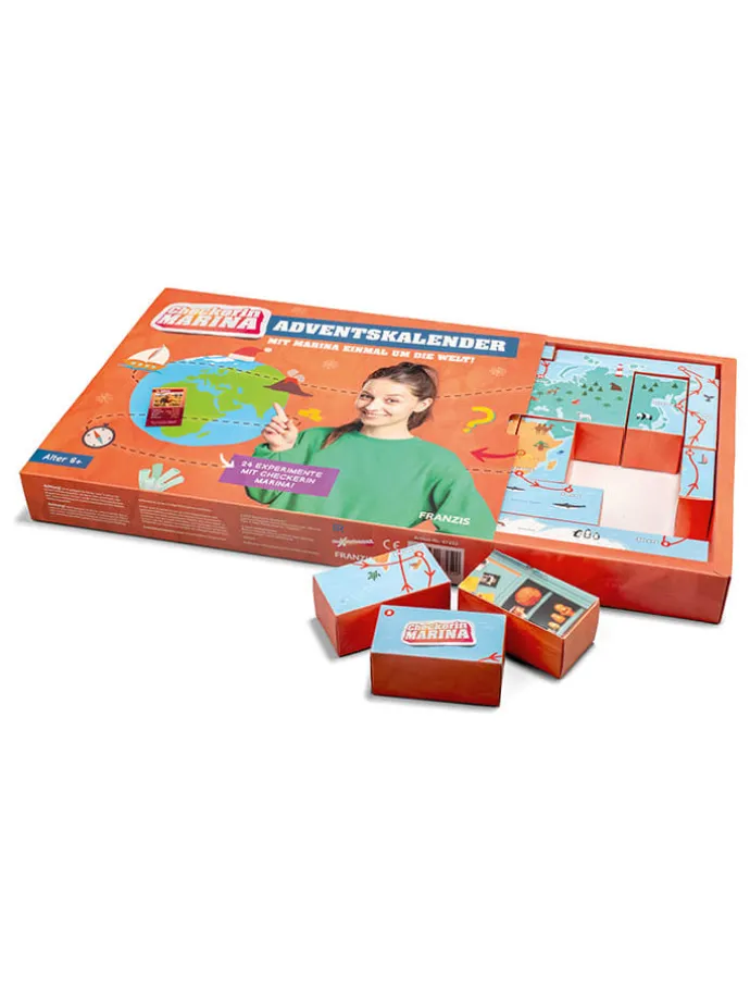Mit dem „Checkerin Marina“-Adventskalender reist du Tag für Tag um die Welt und entdeckst spannende Fakten zu Schifffahrt, Navigation sowie Architektur und Landschaften fremder Länder. Begleite Marina auf ihren Abenteuern und erfahre in 24 Experimenten, wie Seefahrer einst die Weltmeere erkundeten.