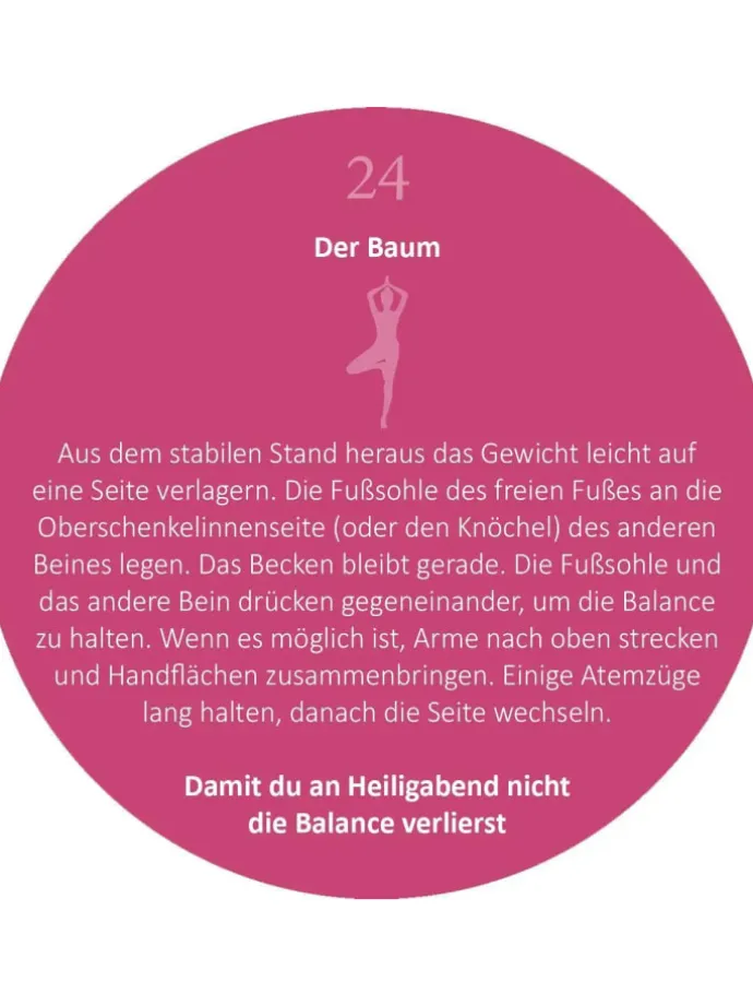 Der Yoga-Adventskalender in der Dose! Für zu Hause, für unterwegs, für zwischendurch: 24 Karten für eine entspannte und achtsame Weihnachtszeit. Mit einer simplen, alltagstauglichen Yoga-Übung für jeden Tag begleitet dieser Adventskalender Sie durch die Vorweihnachtszeit. Für mehr Gelassenheit im alljährlichen Weihnachtstrubel!