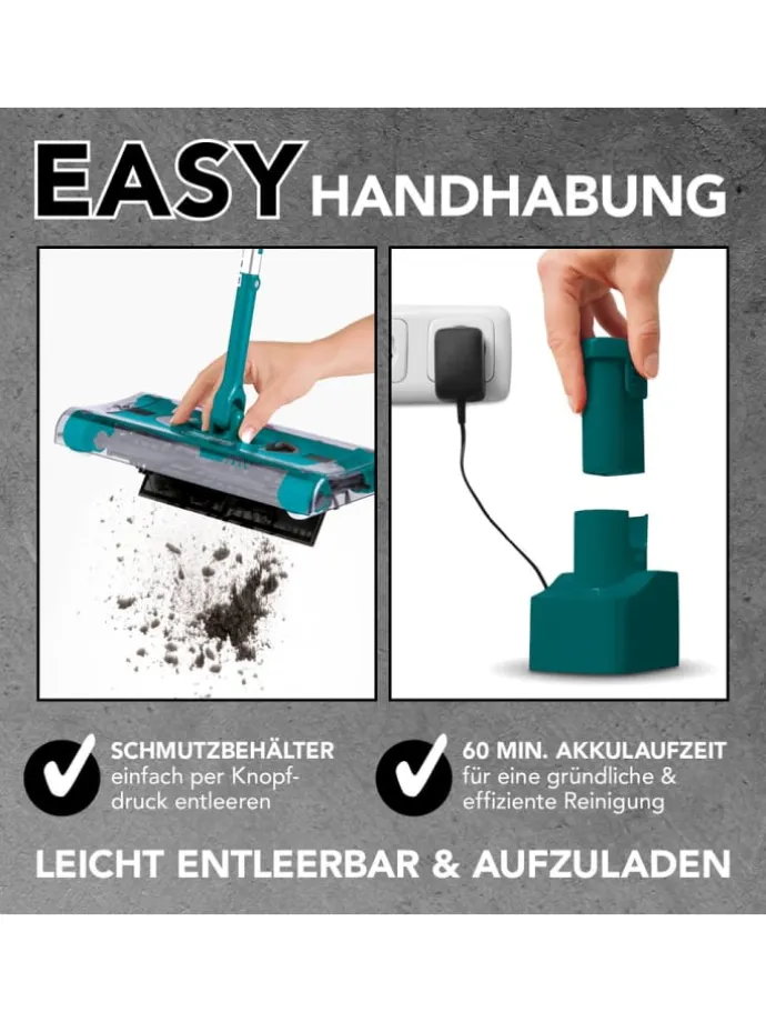 Mit dem kabellosen Swivel Sweeper Akkubesen hält eine bewährte Technologie der Bodenreinigung bei dir Einzug. Das Geheimnis seiner effektiven und schnellen Reinigungskraft ist sein 4-seitiges Bürstensystem mit den in alle vier Richtungen rotierenden Rundbürsten. Sie gleiten über Schmutz und Staub auf Fliesen, Teppichen und Holzböden und nehmen ihn restlos auf.