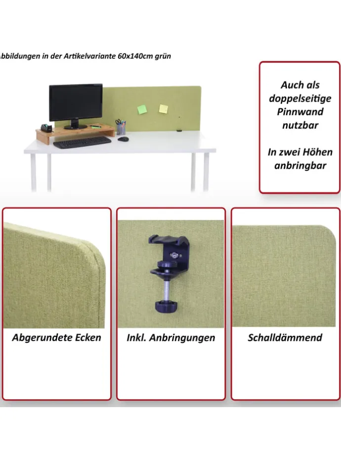 – Dieses Sichtschutzelement ist multifunktional. Es kann sowohl als mobile Trennungswand mit beidseitiger Pinnfläche, sowie auch als Schreibtischtrennwand zur Akustikdämmung genutzt werden und für ein angenehmeres Arbeitsumfeld sorgen.
