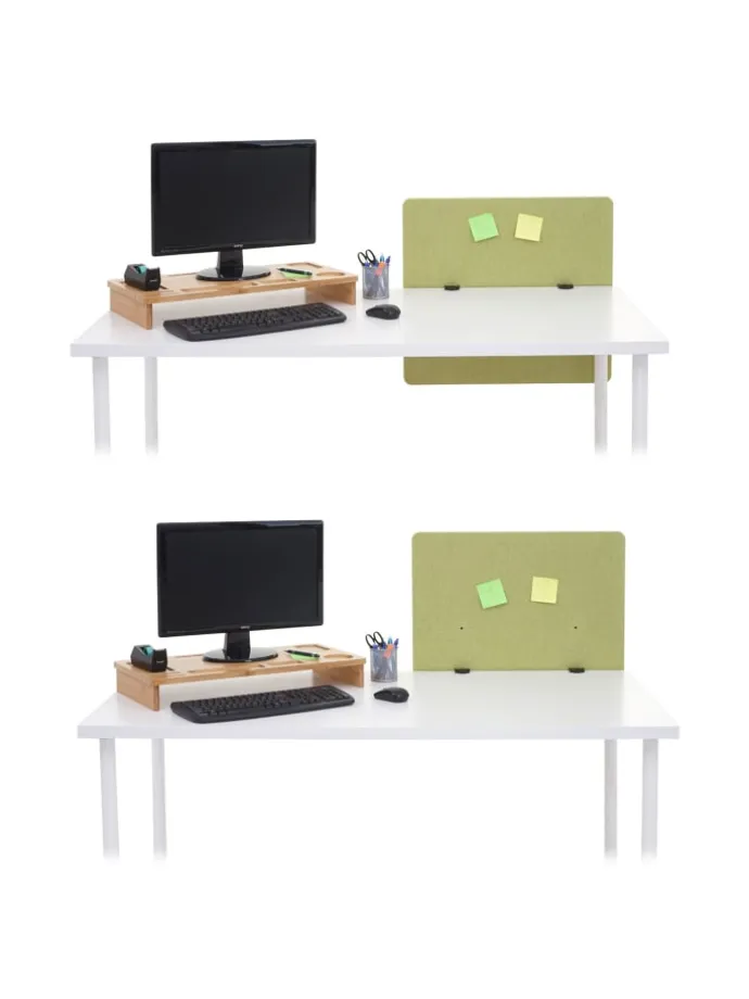 Dieses vielseitige Tischelement eignet sich für Arbeitsräume wie zum Beispiel einem Büro oder einem Klassenraum, in welchem man den Geräuschpegel reduzieren und ein besseres Arbeitsklima schaffen möchte, um die Konzentrationsfähigkeit zu steigern. Hier kann die Trennwand auch zusätzlich als Nies- und Hustenschutz zum Einsatz kommen. Zudem sorgt die moderne Schallwand für mehr Privatsphäre zwischen zwei Arbeitsplätzen an Ihrem Schreibtisch. Die Anbringung der Trennwand kann an zwei unterschiedlichen Positionen befestigt werden. Durch ihr unaufdringliches Design lässt sich die Klemmtrennwand in Ihre bestehende Einrichtungen bestens integrieren.