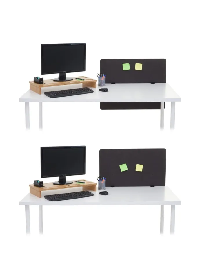 Dieses vielseitige Tischelement eignet sich für Arbeitsräume wie zum Beispiel einem Büro oder einem Klassenraum, in welchem man den Geräuschpegel reduzieren und ein besseres Arbeitsklima schaffen möchte, um die Konzentrationsfähigkeit zu steigern. Hier kann die Trennwand auch zusätzlich als Nies- und Hustenschutz zum Einsatz kommen. Zudem sorgt die moderne Schallwand für mehr Privatsphäre zwischen zwei Arbeitsplätzen an Ihrem Schreibtisch. Die Anbringung der Trennwand kann an zwei unterschiedlichen Positionen befestigt werden. Durch ihr unaufdringliches Design lässt sich die Klemmtrennwand in Ihre bestehende Einrichtungen bestens integrieren.