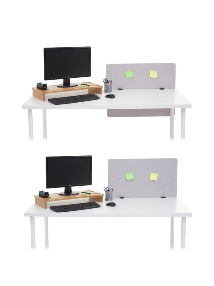 Dieses vielseitige Tischelement eignet sich für Arbeitsräume wie zum Beispiel einem Büro oder einem Klassenraum, in welchem man den Geräuschpegel reduzieren und ein besseres Arbeitsklima schaffen möchte, um die Konzentrationsfähigkeit zu steigern. Hier kann die Trennwand auch zusätzlich als Nies- und Hustenschutz zum Einsatz kommen. Zudem sorgt die moderne Schallwand für mehr Privatsphäre zwischen zwei Arbeitsplätzen an Ihrem Schreibtisch. Die Anbringung der Trennwand kann an zwei unterschiedlichen Positionen befestigt werden. Durch ihr unaufdringliches Design lässt sich die Klemmtrennwand in Ihre bestehende Einrichtungen bestens integrieren.