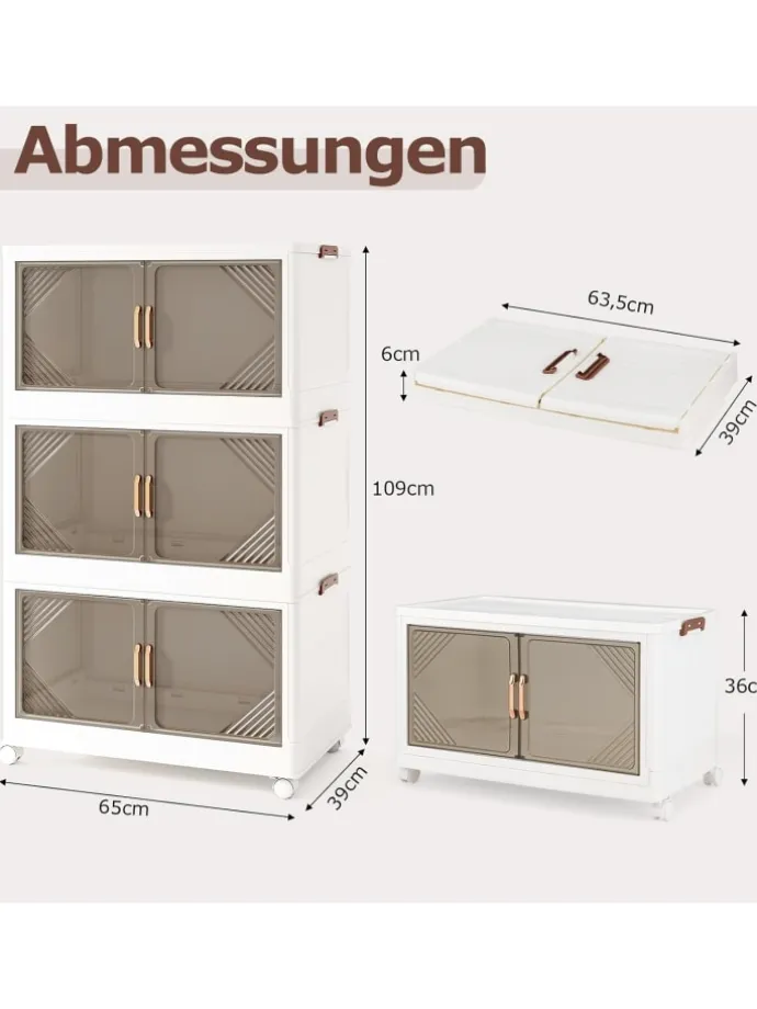 Schick und praktisch, bietet er ein müheloses Falt- und Stapeldesign, seitliche Schnallen zum Verriegeln und transparente Türen, die die Gegenstände sichtbar und ordentlich anordnen – perfekt für den cleveren Organisierer. Rollen Sie ihn mühelos auf seinen 360°-Rollrollen oder verriegeln Sie ihn an Ort und Stelle. Ob Sie das Chaos in Ihrem Schlafzimmer, Wohnzimmer oder Vorratskammer zähmen, dieser Aufbewahrungsbehälter ist Ihre Geheimwaffe für ein elegantes, organisiertes Zuhause.