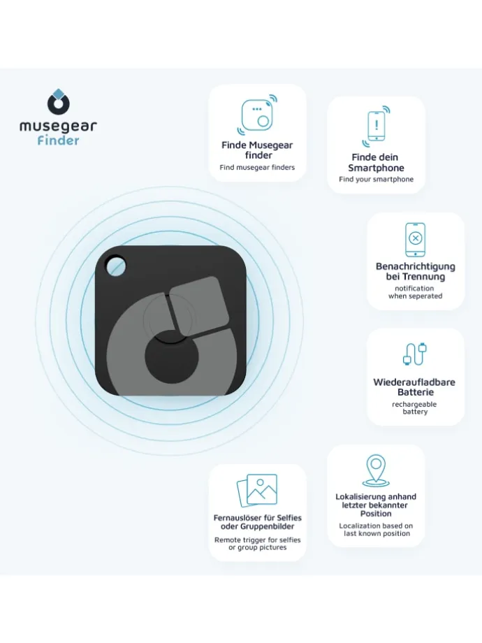 Egal ob Wohnungsschlüssel, Autoschlüssel, Geldbeutel, Smartphone, Fernbedienung, Tablet oder Handtasche. Mit dem innovativen und höchst effizienten musegear Tracker findest Du alles in Sekundenschnelle wieder.