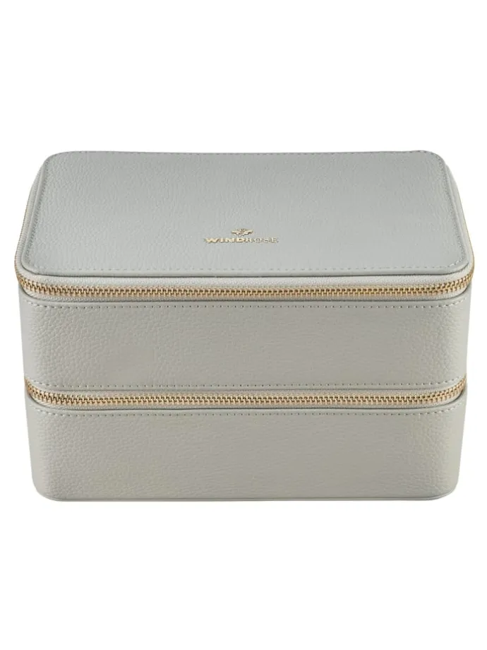 Dieser edle Schmuckkasten von Windrose bietet stilvolle Aufbewahrung für Ihre Schmuckschätze. Mit zwei großzügigen Hauptfächern und speziellen Fächern für verschiedene Schmuckarten hält er alles geordnet bereit. Zwei herausnehmbare Etuis bieten Flexibilität für unterwegs, während das dezente Windrose-Logo auf der Front für Eleganz steht. Sicherer Reißverschluss inklusive.