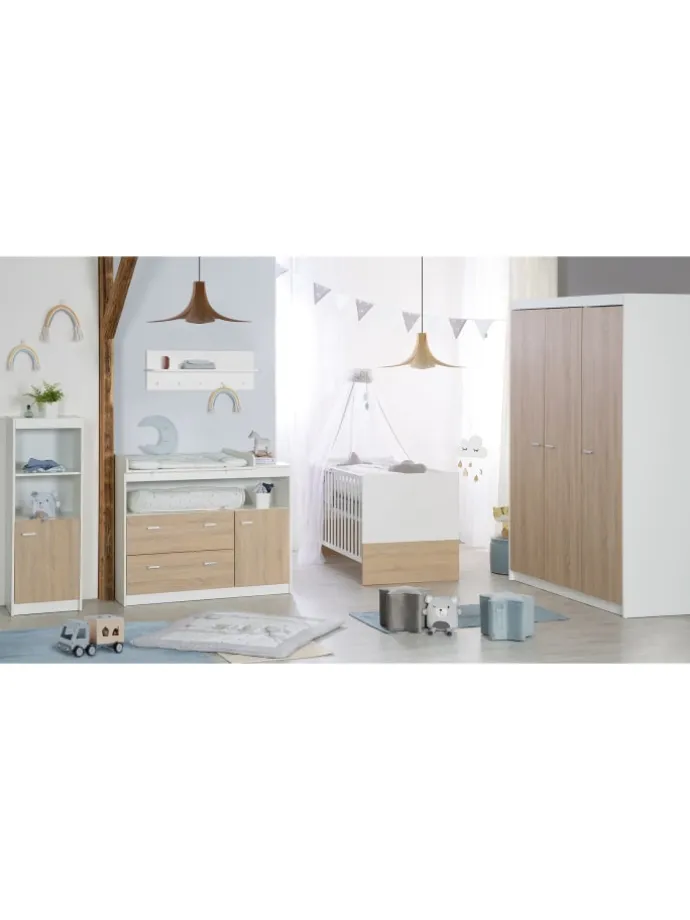 Das roba Kinderzimmerset „Gabriella“ ist mit seiner modernen, zweifarbigen Optik mit Korpus im Dekor „Weiß“ und Fronten im Dekor „Sonoma Eiche Sägerau hell“ eine wunderschönes erstes Baby- und Kinderzimmer. Das Set besteht aus einem Kombi-Kinderbett und einer breiten Wickelkommode. Das mitwachsende Kinderbett kann zum Juniorbett umgebaut werden. So findet es bis zum 7. Lebensjahr (bzw. einem Gewicht von 50 kg) Verwendung. Besonders angenehm um Ihr Baby aus dem Bett zu heben ist die obere Position des 3-fach höhenverstellbaren Gitterbetts. Die 3 herausnehmbaren Schlupfsprossen ermöglichen Ihrem Kind den sicheren Ein- und Ausstieg. Die Wickelkommode mit Wickelansatz macht mit ihrer angenehmen Wickelhöhe von 90 cm die Babypflege für Eltern und Baby zum Vergnügen. Durch den Vollauszug der oberen Schublade ist bei der Babypflege alles griffbereit. Ohne Wickelansatz dient der Wickeltisch als Kommode. Die Kindermöbelserie „Gabriella“ ist eph zertifiziert und trägt das Qualitätssiegel blauer Engel, das garantiert, dass alle verwendeten Materialien höchste Ansprüche an Umwelt-, Gesundheits- & Gebrauchseigenschaften erfüllen. Die Kindermöbelserie „Gabriella“ ist in Deutschland entwickelt und in der EU produziert. Maße Bett H x B x T: 80 x 76 x 142 cm. Liegefläche 70 x 140 cm. Maße Wickelkommode H x B x T: 98,1 x 117,1 x 75 cm.