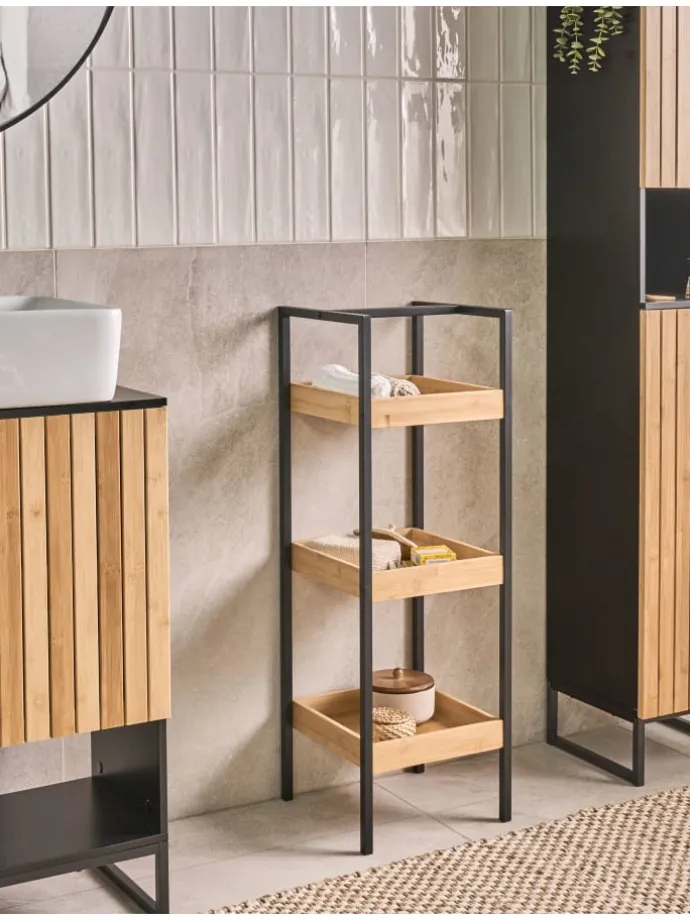 Badezimmer- Aufbewahrungssystem mit drei Ablagen. Dieses praktische Badezimmerregal mit offenen Fachböden ist eine elegante Lösung zur Aufbewahrung von Handtüchern, Toilettenartikeln und Accessoires. Es kombiniert natürliche Bambusfachböden mit einem robusten Stahlrahmen, der für Langlebigkeit und ein modernes Aussehen sorgt. Dank seiner drei Ablageflächen trägt es dazu bei, Ihr Badezimmer ordentlich zu halten, und bietet gleichzeitig einfachen Zugriff auf Dinge des täglichen Bedarfs.