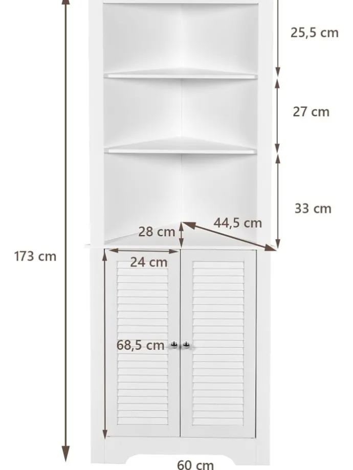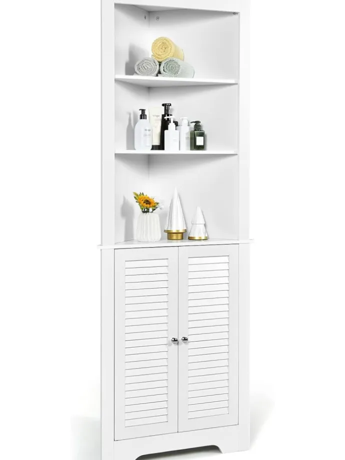 Unser multifunktionaler Eckschrank bietet Ihnen viel Stauraum für verschiedenste Gegenstände. Hergestellt aus hochwertiger MDF-Platte ist dieser Badezimmerschrank stabil und langlebig. Das dreilagige offene Regal und der geschlossene Hochschrank bieten ausreichend Platz für Handtücher, Duschgel, Bücher und andere Utensilien. Das elegante und moderne Design passt perfekt in Ihr Badezimmer, Schlafzimmer und Wohnzimmer. Wenn Sie Wert auf Ordnung und Sauberkeit legen, werden Sie ihn lieben.