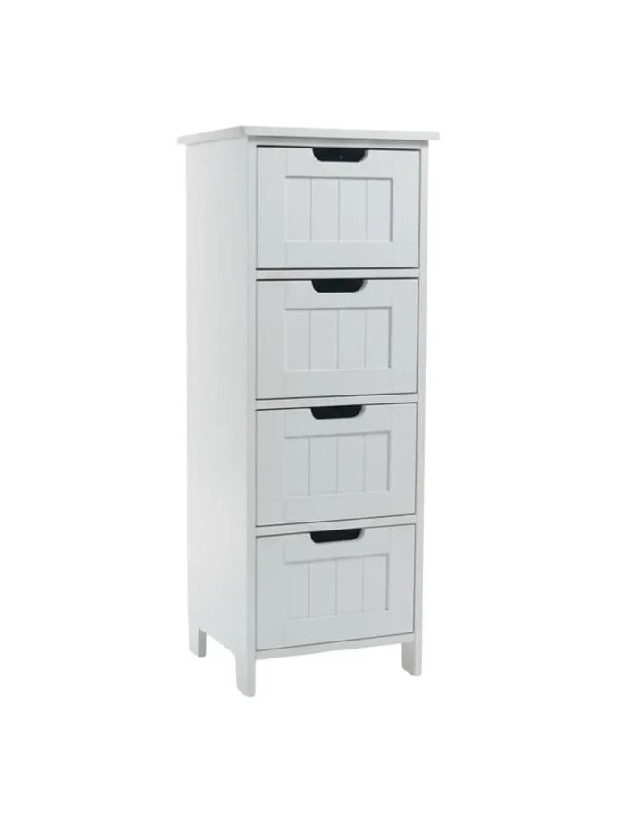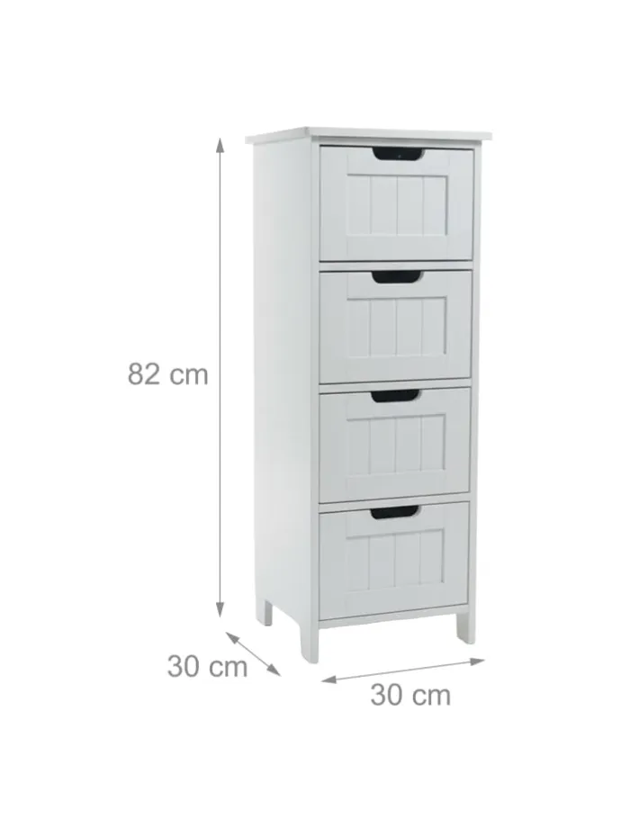 Das kompakte Schränkchen eignet sich ideal zur Aufbewahrung von Handtüchern und Kosmetikartikeln im Badezimmer, macht aber auch als Flurschrank für Accessoires oder als Küchenschrank für Vorräte eine gute Figur. Platzsparend und doch geräumig bietet die Badkommode in 4 Schubladen ausreichend Stauraum. Optisch überzeugt der Bad-Schubladenschrank mit seinem dekorativen Design im Landhausstil und den Füßen, die für einen leichten, eleganten Look sorgen.
