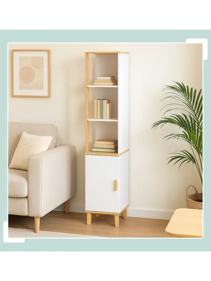 Dieser Badhochschrank überzeugt mit seinem kompakten Format und überraschend großzügigem Stauraum. Drei offene Fächer bieten Platz für Alltagsprodukte, während ein Türfach mit verstellbarem Einlegeboden zusätzliche Aufbewahrungsmöglichkeiten schafft. Der vielseitige Mehrzweckschrank macht sowohl im Bad als auch in der Küche oder im Wohnzimmer eine gute Figur. Mit seiner Kombination aus weißer Oberfläche und natürlichem Bambus verleiht der Hochschrank jedem Raum einen frischen, modernen Look.