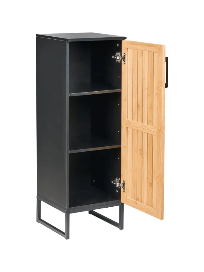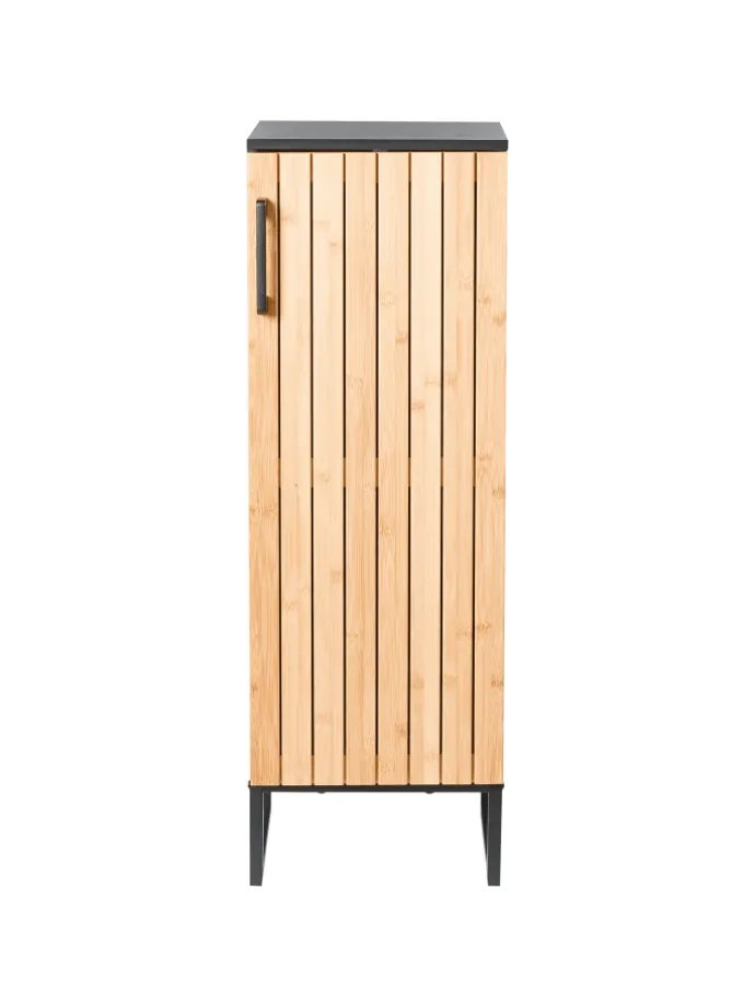 Kleiner Badezimmerschrank mit drei Ablageflächen. Dieser kompakte Schrank ist die ideale Lösung für kleinere Badezimmer, in denen jeder Zentimeter zählt. Die Kombination aus natürlichem Bambusholz und einem mattschwarzen Rahmen verleiht ihm eine stilvolle Optik und setzt einen eleganten und modernen Akzent. Der Schrank ist mit Regalen ausgestattet, die sich hinter einer Tür befinden. Es handelt sich um ein funktionales Möbelstück, das für Ordnung sorgt und dem Interieur gleichzeitig einen einzigartigen Charakter verleiht.