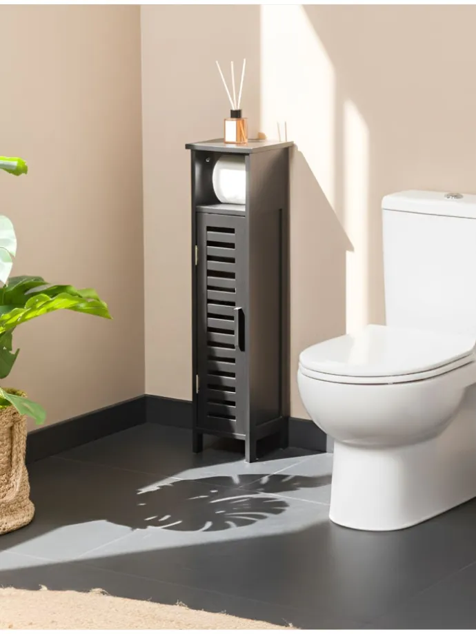 Schmaler Badschrank zur Aufbewahrung von Toilettenpapier. Dieser halbhohe Badschrank mit Lamellen-Tür besteht vollständig aus robustem Bambusholz, das wegen seiner Feuchtigkeitswiderstandsfähigkeit perfekt für jedes Badezimmer ist. Er verfügt nicht nur über einen integrierten Halter für die Toilettenpapierrolle, er besitzt auch 2 versteckte Ablageflächen. Nutzen Sie die Regalflächen entweder für weitere Klopapierrollen oder Ihre Badutensilien, um diese immer griffbereit in Ihrer Reichweite zu haben und für Ordnung im Bad zu sorgen. Dank seiner kompakten Größe passt der Schrank in jede Badezimmerecke und wertet dabei die Einrichtung durch seinen stilvollen Farbton auf.