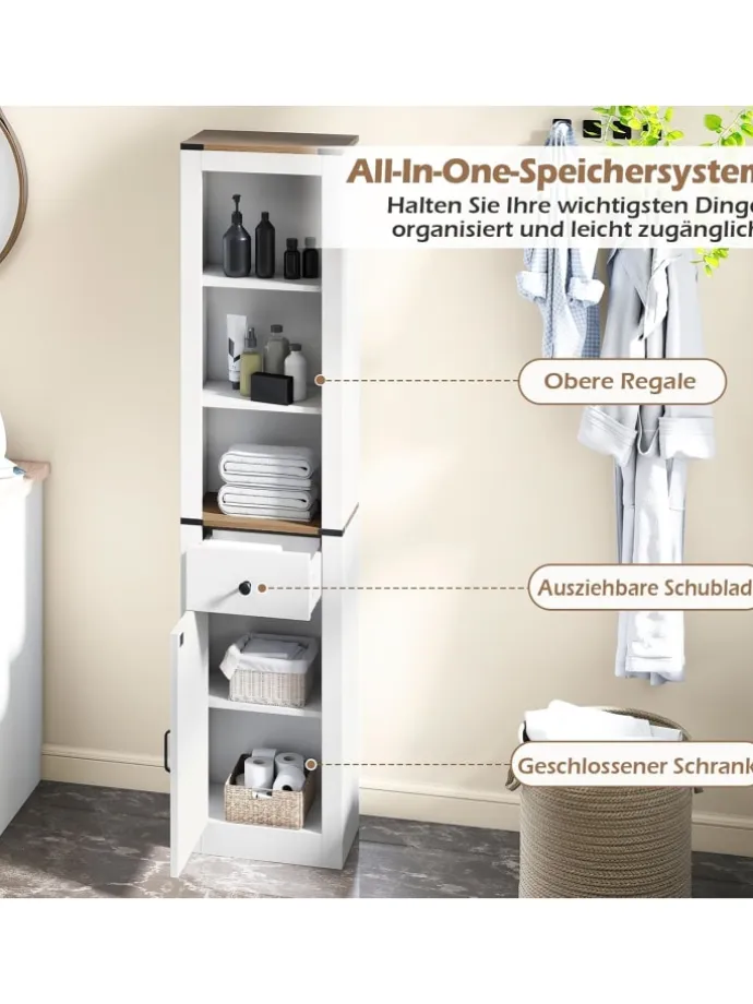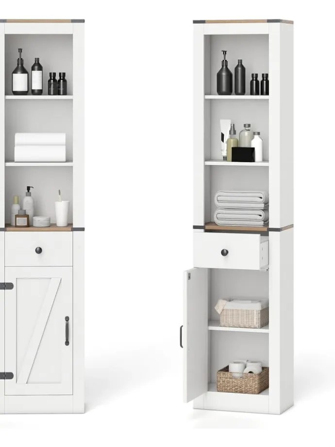 Optimieren Sie Ihre Badezimmeraufbewahrung mit diesem vielseitigen und sicheren Schrank. Die Kombination aus offenen Regalen, einer Schublade und einem geschlossenen Schrankfach sorgt für ordentliche und leicht zugängliche Aufbewahrung Ihrer Essentials. Ein verstellbares Regal mit drei Positionen passt sich flexibel an unterschiedliche Gegenstände an. Die stabile Konstruktion mit integriertem Kippschutz bietet langlebige Sicherheit. Das rustikale Design mit charakteristischer Scheunentür verleiht Ihrem Bad einen charmanten Landhausstil. Dieser elegante Hochschrank eignet sich nicht nur fürs Badezimmer, sondern auch ideal für Waschraum, Küche oder Wohnzimmer, um Stauraum auch in kleinen Räumen effektiv zu erweitern. Hochwertige Verarbeitung und durchdachte Details runden das Gesamtbild ab.