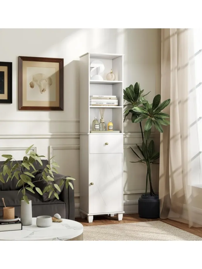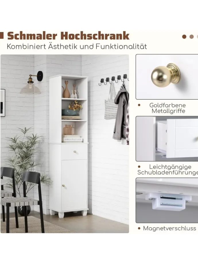 Dieser schlanke, hohe Badschrank vereint ansprechendes Design mit hoher Funktionalität und nutzt den verfügbaren Platz optimal aus. Speziell entwickelt für Bad, Küche oder Wohnzimmer, bietet er zusätzlichen Stauraum, ohne den Raum optisch zu dominieren. Mit drei offenen Regalfächern, einer praktischen Schublade und einem geschlossenen Schrankbereich steht Ihnen viel Platz zur Verfügung. Hinter der Tür befindet sich ein dreifach verstellbares Regal, das sich flexibel an unterschiedlich große Gegenstände anpasst.