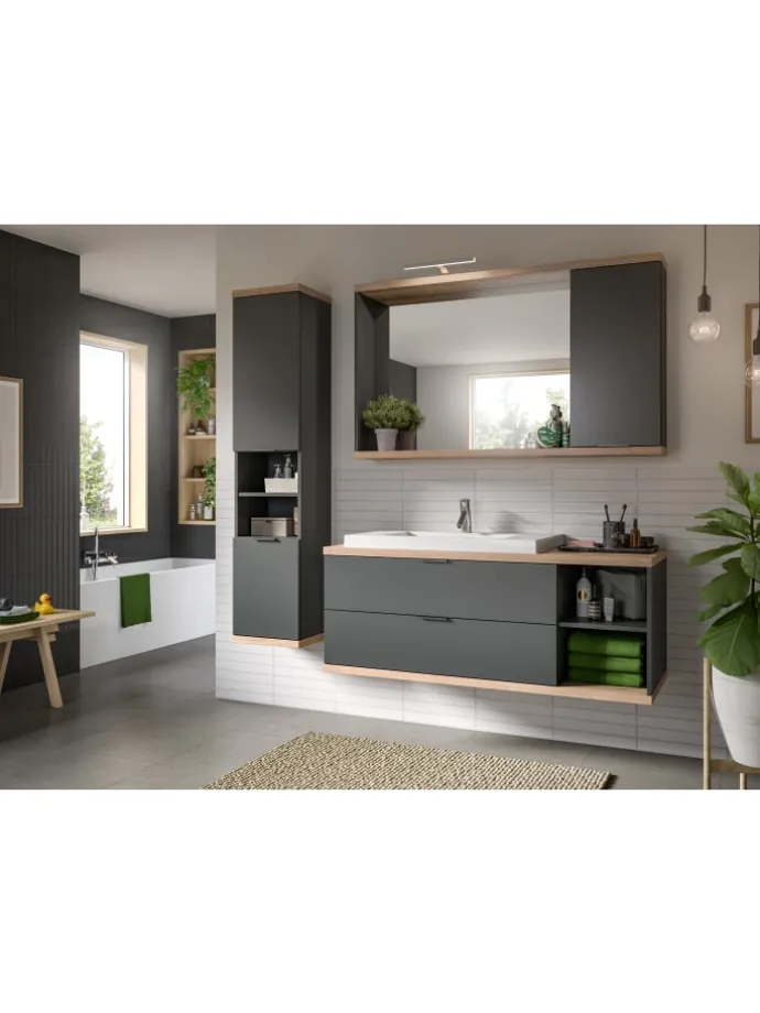 Erweitern Sie Ihr Badezimmer mit unserer vielseitigen Badkombination in edlem Anthrazit-Grau. Die sorgfältig gestaltete Nachbildung verleiht Ihrem Raum ein modernes und ansprechendes Ambiente. Diese durchdachte Kombination aus verschiedenen Elementen bietet nicht nur ausreichend Stauraum, sondern verleiht Ihrem Badezimmer auch eine ästhetische Note. Entdecken Sie jetzt die perfekte Lösung für Ihr Badezimmerdesign.