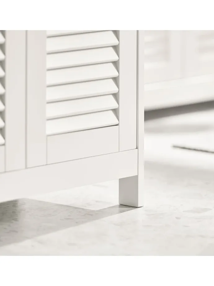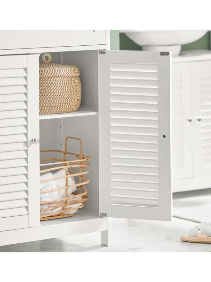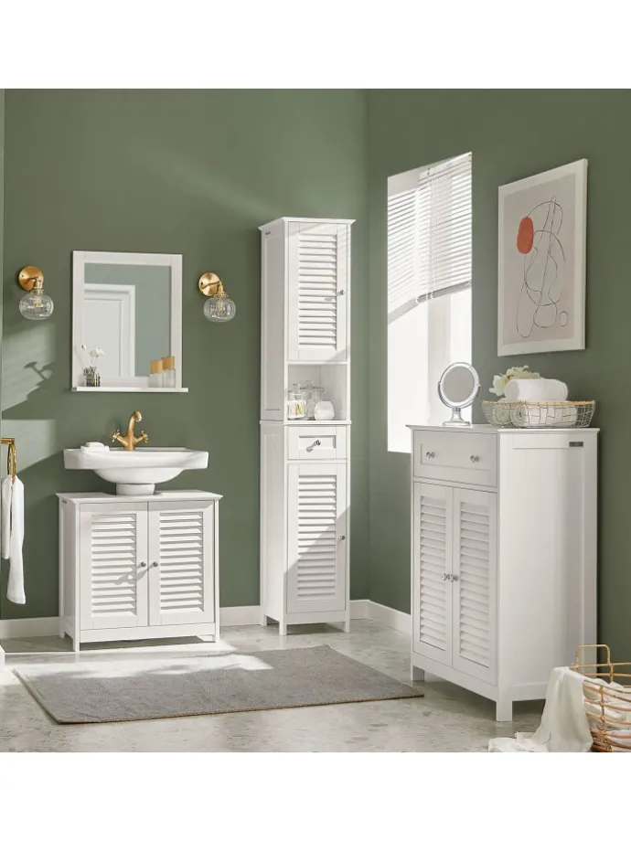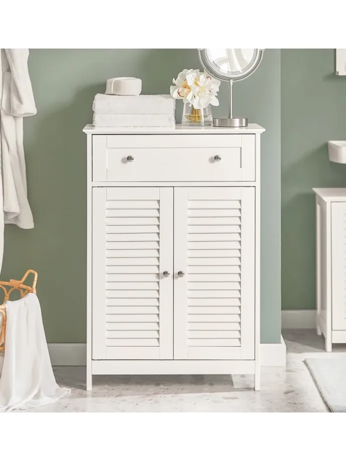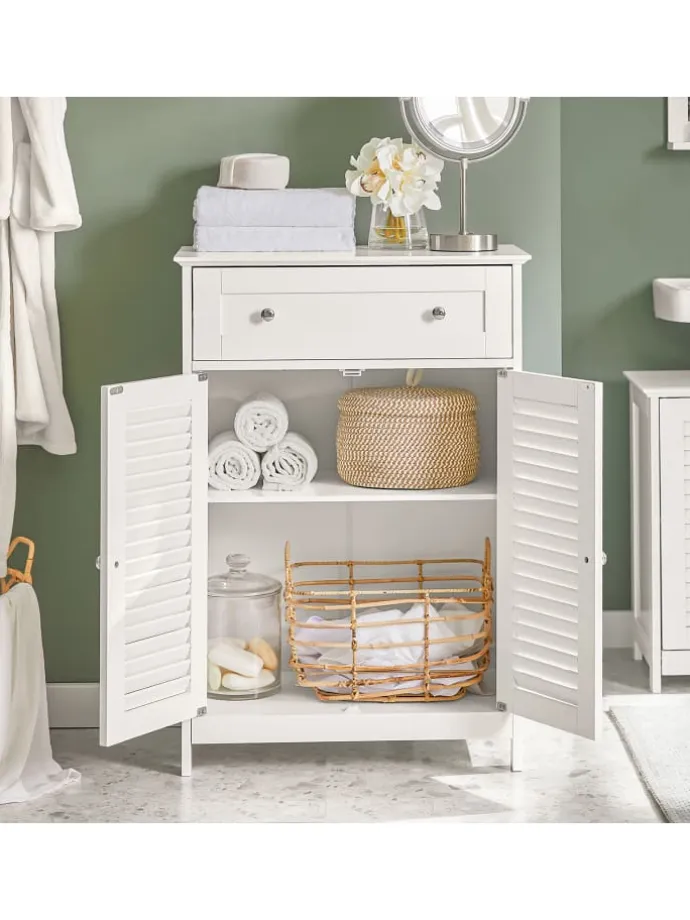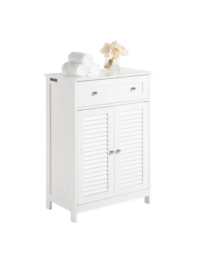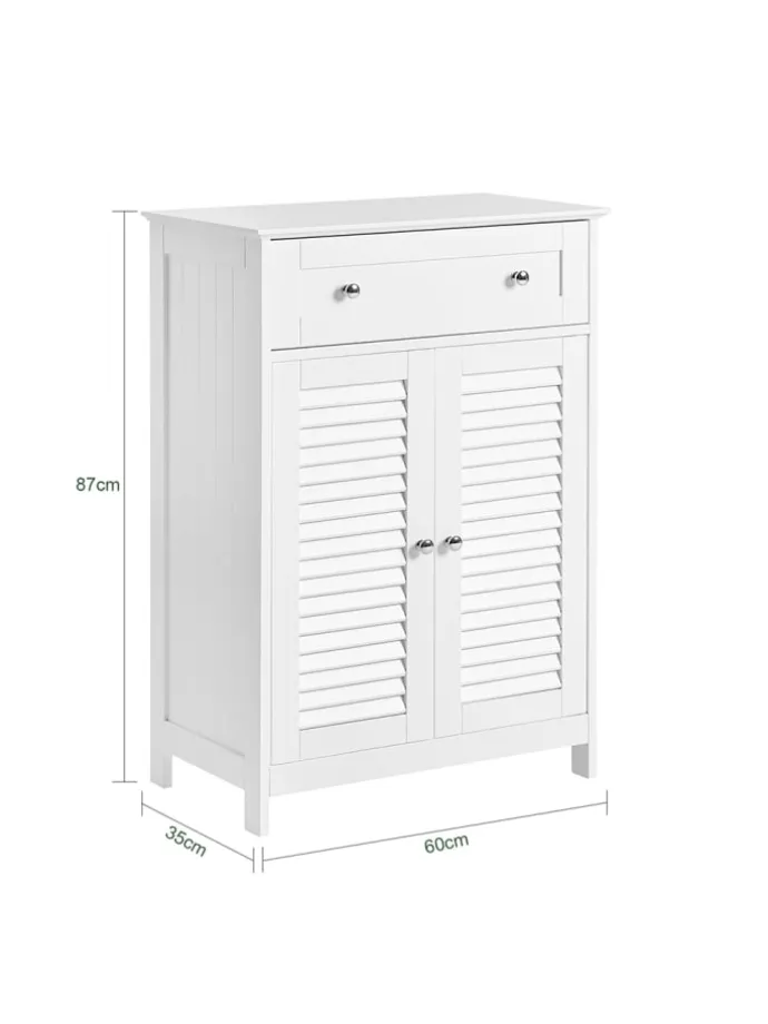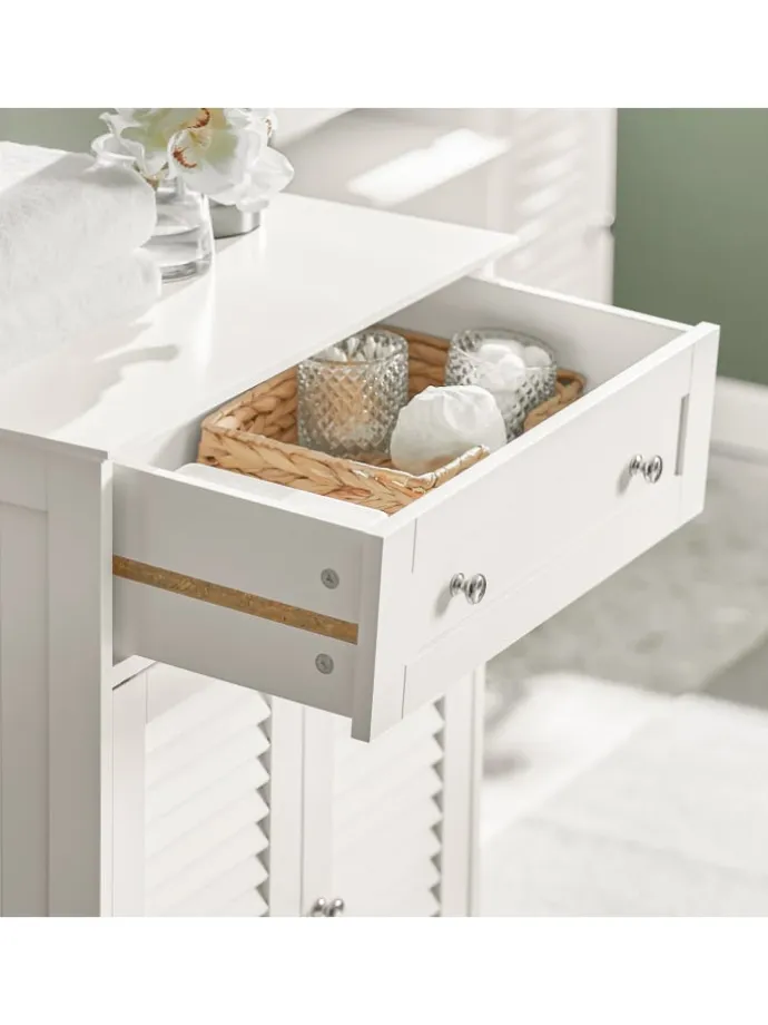 Ausgestattet mit 2 Türen sowie einer Schublade, biete diese Kommode viel Stauraum für z.B. Handtücher, Putzmittel oder Utensilien des täglichen Gebrauchs.