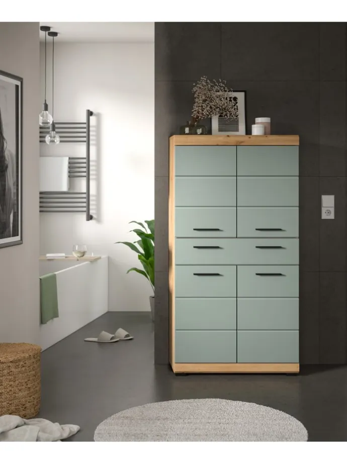 Badmidischrank in Artisan Eiche/Salbei – (B) 74 x (H) 141 x (T) 31