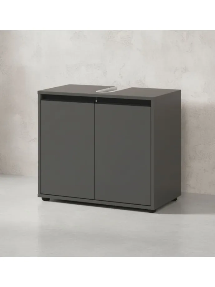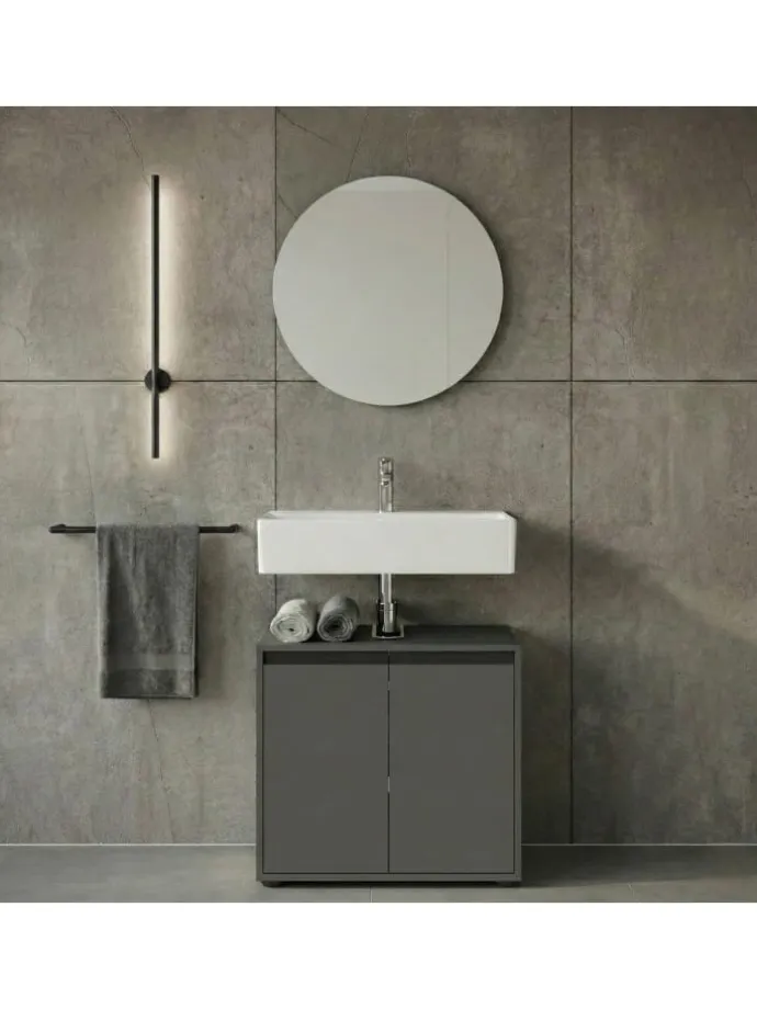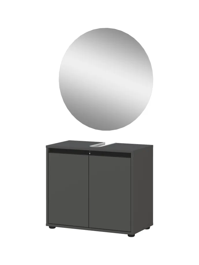 Waschbeckenunterschrank mit zwei Türen, dahinter ein variabler Einlegeboden (belastbar bis zu 10 kg); Oberboden mit Aussparung für den Siphon (belastbar bis zu 3 kg), Unterboden belastbar bis zu 10 kg; Möbel in der Farbe Graphit; zwei Griffleisten in schwarz aus pulverbeschichtetem Metall und vier schwarze Möbelgleiter aus Kunststoff; Melaminharzbeschichtung, hochwertige ABS-Kanten; Türen schließen durch integrierten Dämpfer langsam, sanft und geräuschlos;Runder, rahmenloser Spiegel auf einer melaminharzbeschichteten Trägerplatte in Graphit; kratzfeste und widerstandsfähige Oberflächenbeschichtung, stoß- und schlagfeste Kanten, umweltfreundlich, ohne Styropor verpackt, Made in Germany.