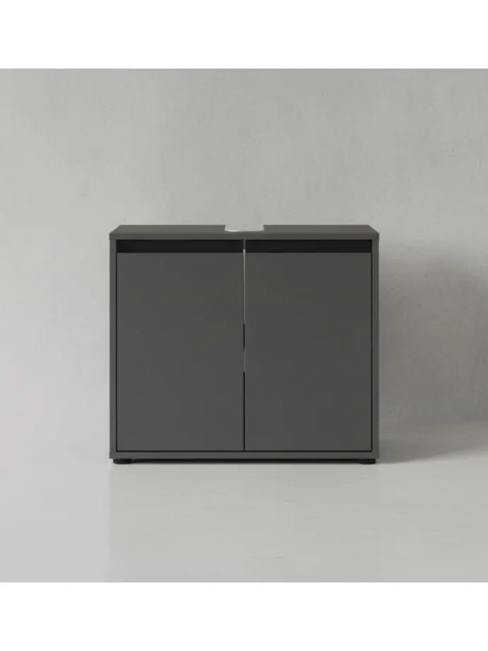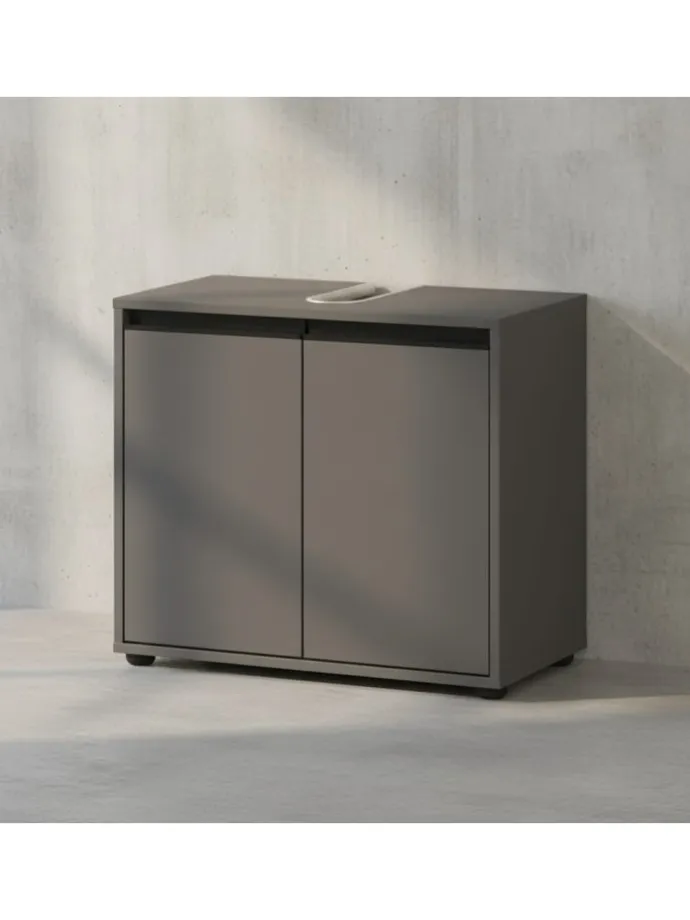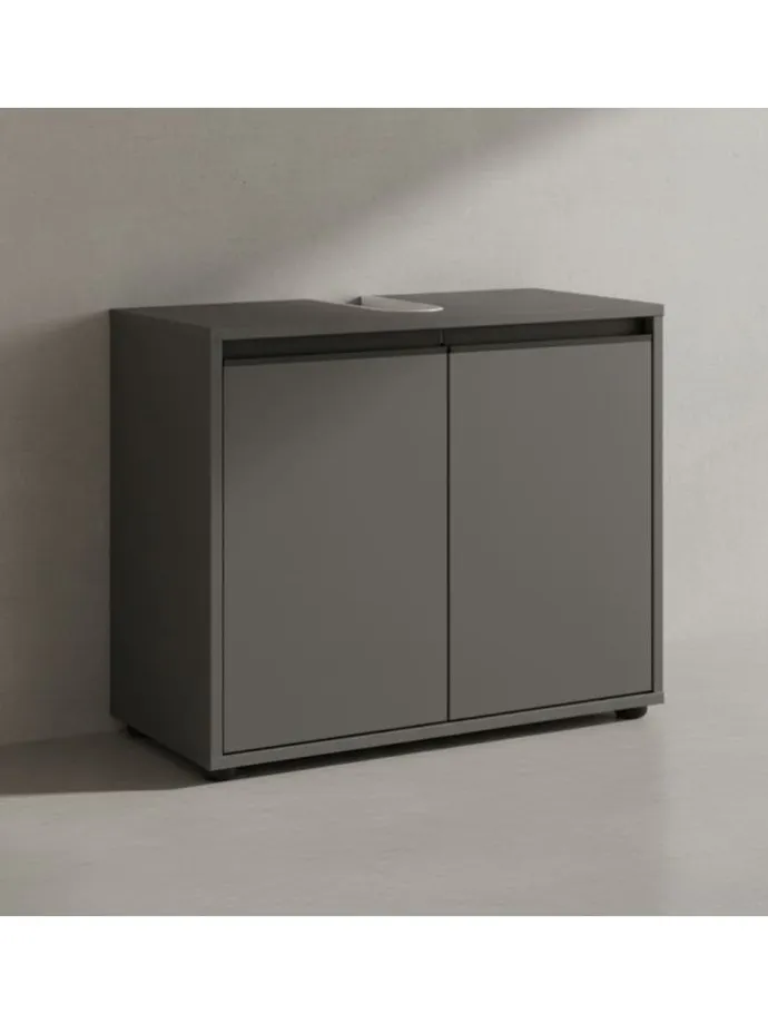 1x Waschbeckenunterschrank (60 cm): Steht auf vier schwarzen Möbelgleitern. Ausgestattet mit Siphon-Aussparung und einem verstellbaren Einlegeboden – ideal für Handtücher und Reiniger.