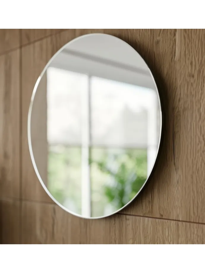 1x Runder Design-Spiegel: Ein rahmenloses Highlight, das den Raum optisch vergrößert und modern wirken lässt. Montiert auf einer stabilen Trägerplatte.