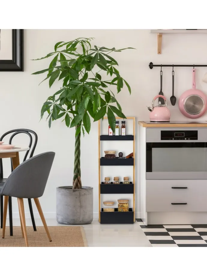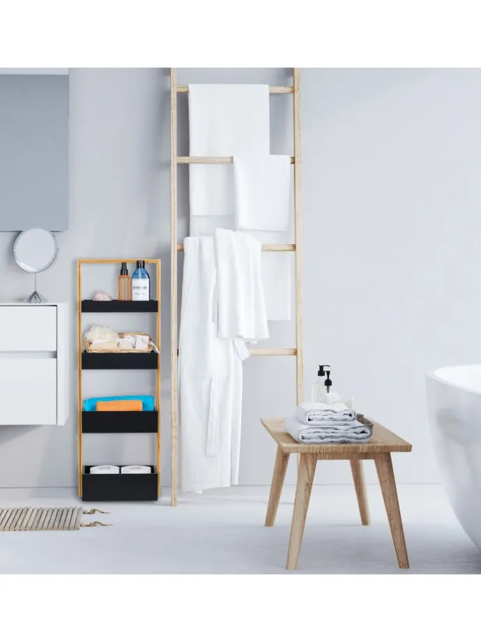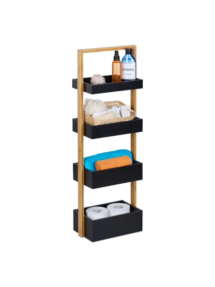 Das Standregal verfügt über ausreichend Stauraum für Badutensilien aller Art, die auf den 4 offenen Ablagen stets griffbereit lagern. Dank seines schmalen Designs ist das Ablageregal dabei auch für kleinere Bäder bestens geeignet. Auch in der Küche, wo es zur Aufbewahrung von Vorräten, Kaffee- und Teedosen dient, macht das Regal eine gute Figur. Durch die dekorative Kombination aus natürlichem Bambus und den mattschwarzen Ablagen ist das Stehregal auch optisch ein Hingucker.