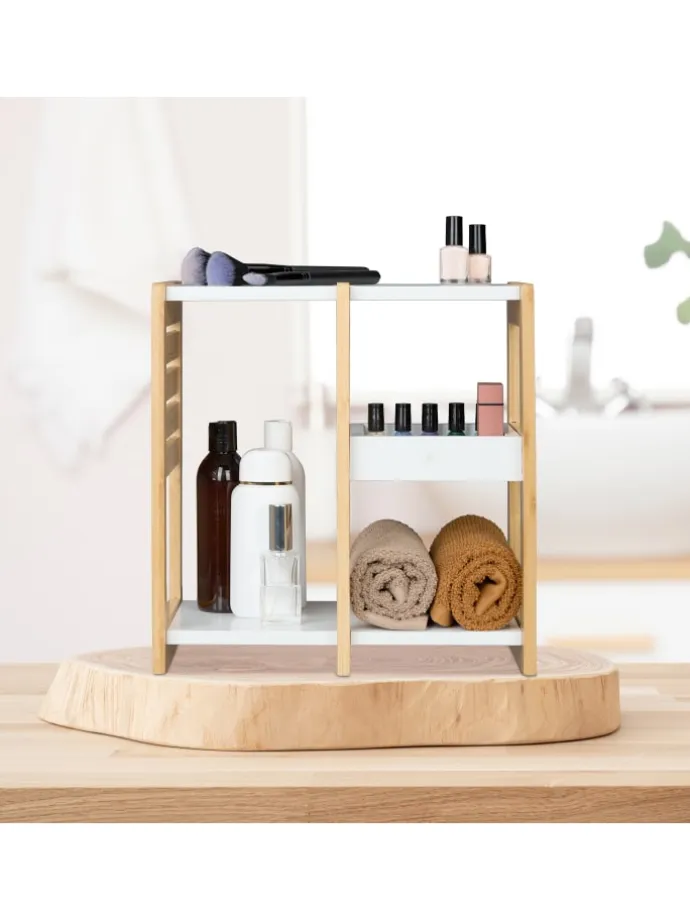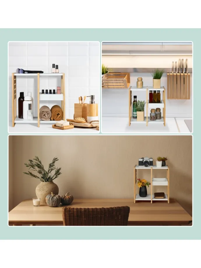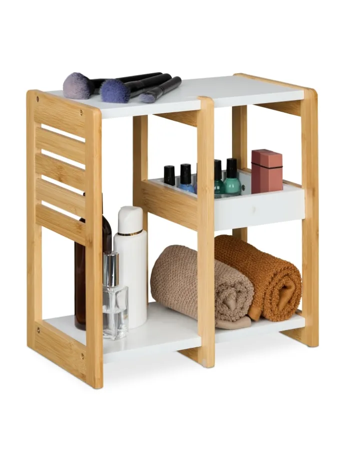 Dieser praktische Badorganizer schafft Stauraum für Badutensilien, Accessoires, Schmuck etc., die auf den 3 offenen Ablagen stets griffbereit lagern. Dank seines kompakten Designs ist das Ablageregal dabei vor allem für kleinere Bäder bestens geeignet. Auch in der Küche, wo es zur Aufbewahrung von Gewürzen, Kaffee- und Teedosen dient, macht das Regal eine gute Figur. Durch die dekorative Kombination aus natürlichem Bambus und den weißen Ablagen ist das Aufsatzregal optisch ein wahrer Hingucker.
