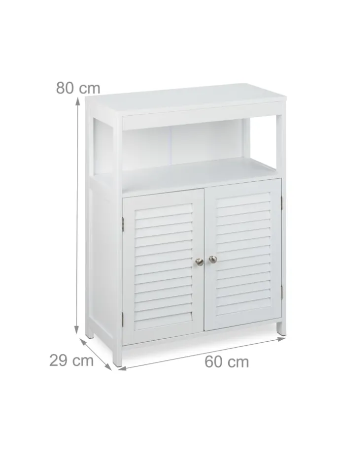 Mit diesem Badschrank schaffst Du praktischen Stauraum für Deine Badartikel. In den 2 Fächern des Badschränkchens kannst Du Handtücher, Kosmetikprodukte und Putzmittel ordentlich hinter geschlossenen Türen verstauen. Die offenen Ablagen bieten schnellen Zugriff auf die wichtigsten Utensilien. Optisch überzeugt die Badezimmerkommode mit ihrem stilvollen Design, das in jedem Bad tolle Akzente setzt. Dank seiner kompakten Bauweise passt der Midischrank auch wunderbar in kleine Räume.