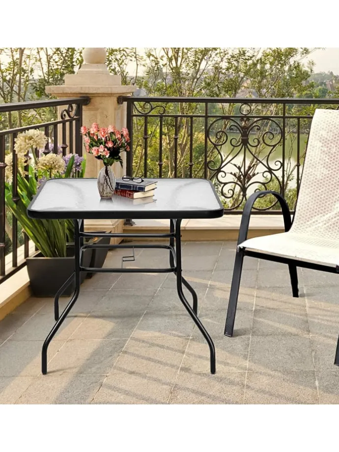 Sein pulverbeschichteter schwarzer Stahlrahmen ist langfristig nutzbar und stabil, mit einer Tragkraft von bis zu 50 kg. Die Tischplatte aus Hartglas trocknet schnell und ist ideal für eine Familienzusammenkunft. In der Mitte befindet sich ein Loch für Sonnenschirme, wodurch Sie Ihren Kaffee auch an heißen Tagen draußen genießen können. Der Kaffeetisch ist geeignet für Gärten, Terrassen und andere Außenbereiche