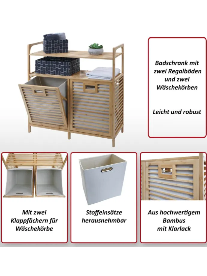 – Der Badezimmerschrank N83 aus hochwertigem Bambus bietet mit zwei Regalböden und zwei Wäschekörben viel Stauraum. Klappfächer erleichtern den Zugriff, die herausnehmbaren Stoffeinsätze sorgen für Ordnung. Ein stilvoller und funktionaler Allrounder.