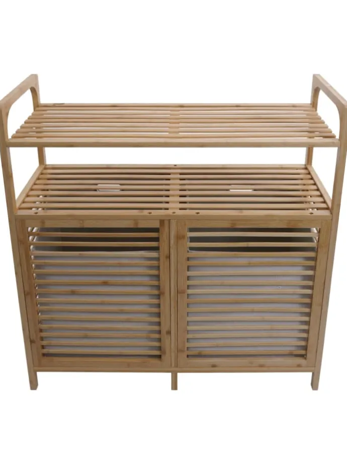 Der Badezimmerschrank N83 kombiniert stilvolles Design mit praktischer Funktionalität und passt sich perfekt in jede Badezimmerumgebung ein. Aus hochwertigem Bambus gefertigt, strahlt er natürliche Eleganz aus und überzeugt durch seine Langlebigkeit. Mit zwei geräumigen Regalböden und zwei integrierten Wäschekörben bietet er reichlich Stauraum für Handtücher, Pflegeprodukte und Wäsche. Die beiden Klappfächer ermöglichen einen einfachen Zugriff, während die herausnehmbaren Stoffeinsätze für Flexibilität sorgen. Dieses vielseitige Möbelstück lässt sich ideal mit weiteren Bambus-Produkten kombinieren, um ein harmonisches Gesamtbild in Ihrem Badezimmer zu schaffen. Mit seiner durchdachten Gestaltung und der warmen Optik des Bambus bringt der Badezimmerschrank N83 Ordnung, Komfort und eine einladende Atmosphäre in Ihr Zuhause – perfekt für alle, die Stil und Funktionalität gleichermaßen schätzen.