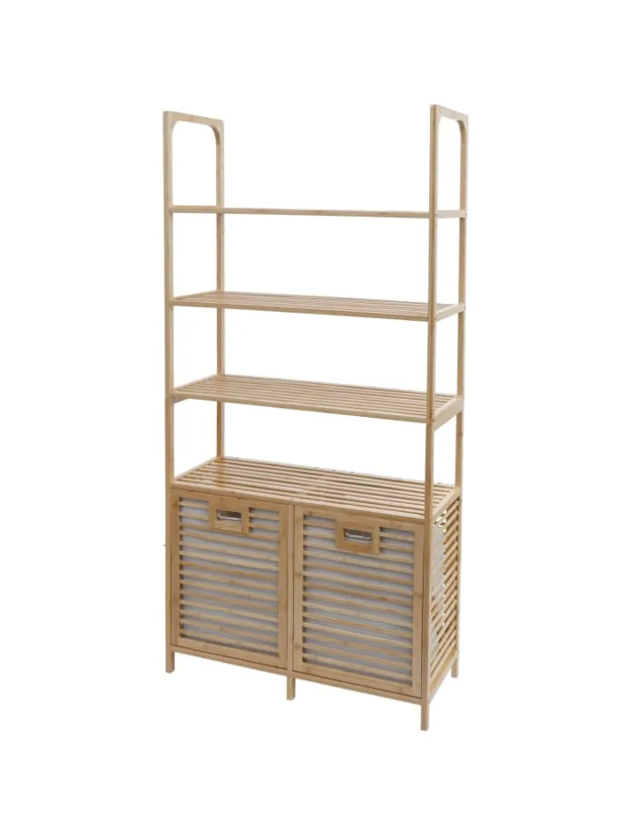 Der Badezimmerschrank N83 kombiniert stilvolles Design mit praktischer Funktionalität und passt sich perfekt in jede Badezimmerumgebung ein. Aus hochwertigem Bambus gefertigt, strahlt er natürliche Eleganz aus und überzeugt durch seine Langlebigkeit. Mit vier geräumigen Regalböden und zwei integrierten Wäschekörben bietet er reichlich Stauraum für Handtücher, Pflegeprodukte und Wäsche. Die beiden Klappfächer ermöglichen einen einfachen Zugriff, während die herausnehmbaren Stoffeinsätze für Flexibilität sorgen.