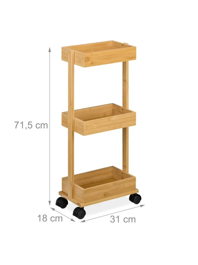 Dieser praktische Rollwagen wird Dein neuer Begleiter im Haushalt. Der Beistellwagen bietet Dir auf 3 Ebenen viel Stauraum, um Kosmetik und andere Badartikel, Reinigungsmittel, aber auch Bastelmaterial, Lebensmittel und mehr immer griffbereit aufzubewahren. Dank der 4 leichtgängigen Rollen kannst du den Nischenwagen bequem verschieben. Zudem überzeugt der Badezimmerwagen mit seinem natürlichen Design aus Bambus.