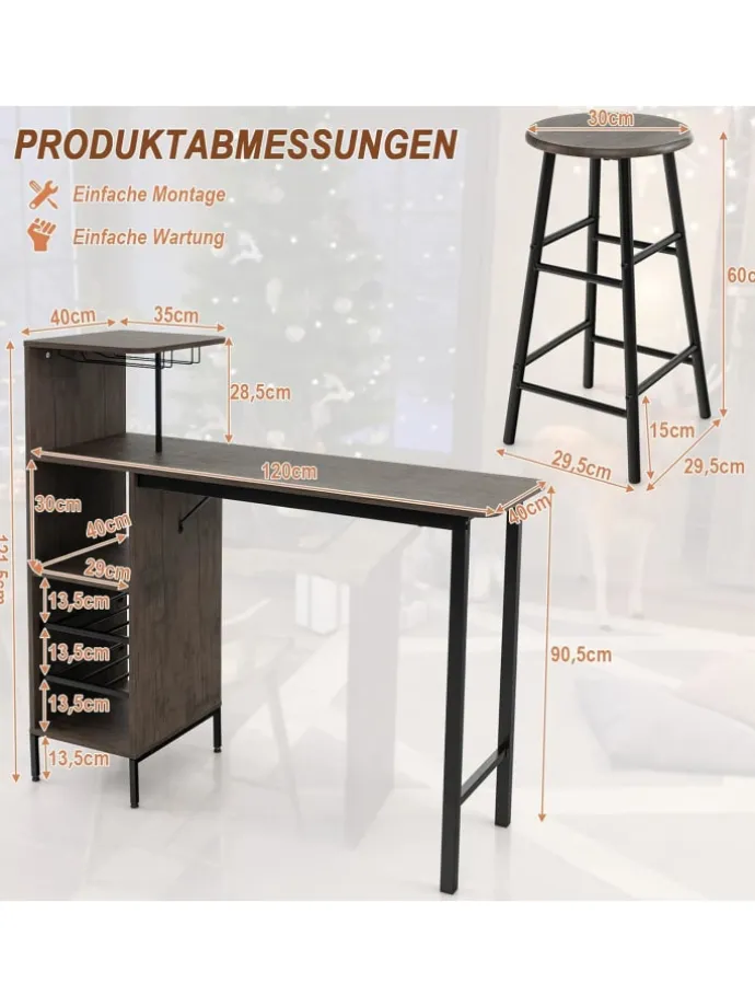 Das rustikale Bartisch- und Hocker-Set wird Ihren Raum schmücken und eine berauschende Atmosphäre schaffen, in der Sie einen Drink genießen können. Der schmale Tisch mit multifunktionalen Seitenablagen kann seinen Zweck erfüllen und bietet klassifizierten Stauraum für Weine, Geschirr und andere Barutensilien.