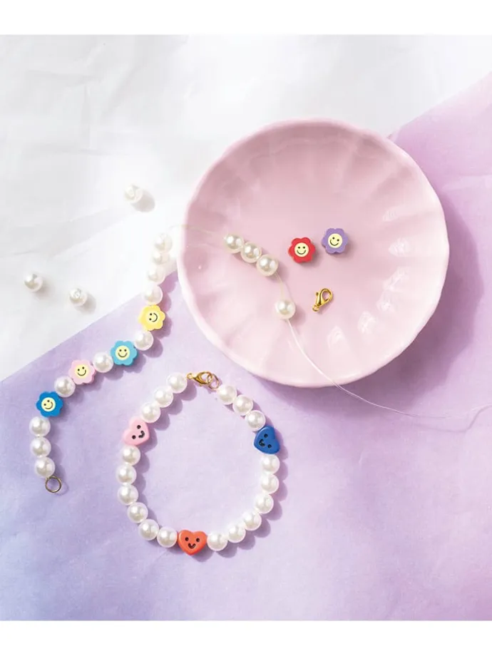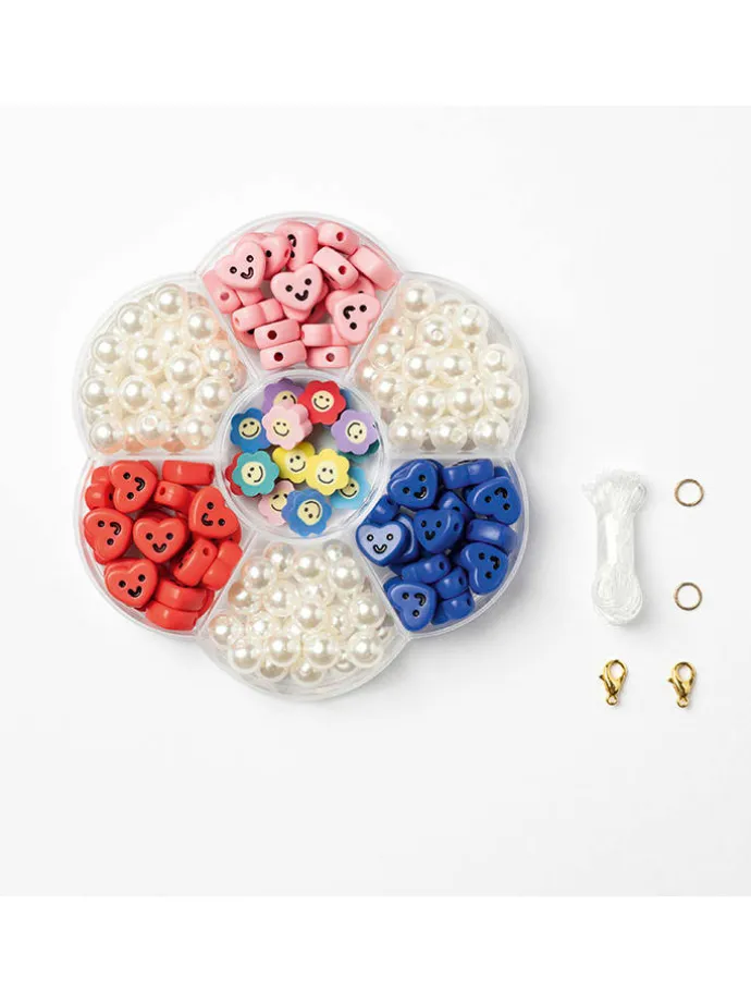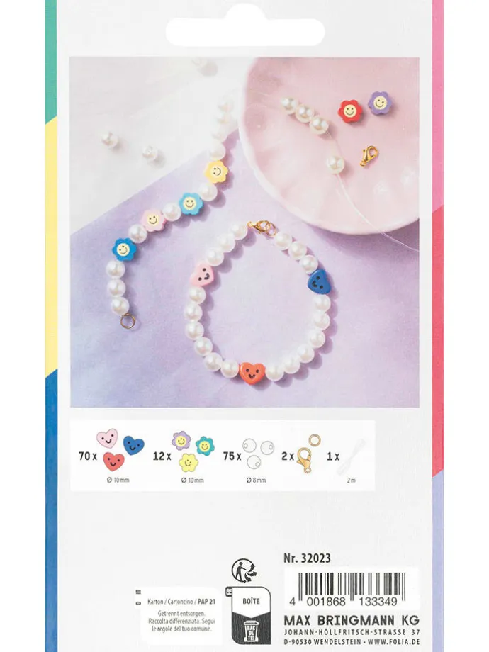 – Inhalt: 72 Perlen in 3 Farben, 78 Schmuckperlen, 14 Daisies, 1 elastischer Nylonfaden, 2 Goldringe, 2 Karabiner