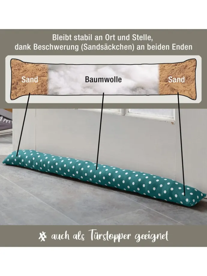 Füllung: Zum Beschweren und für eine bessere Stabilität befinden sich in beiden Enden mit Sand gefüllte Kunststoff-Säckchen (je ca. 10 cm). Dazwischen ist der Zugluftstopper mit Baumwolle gefüllt.