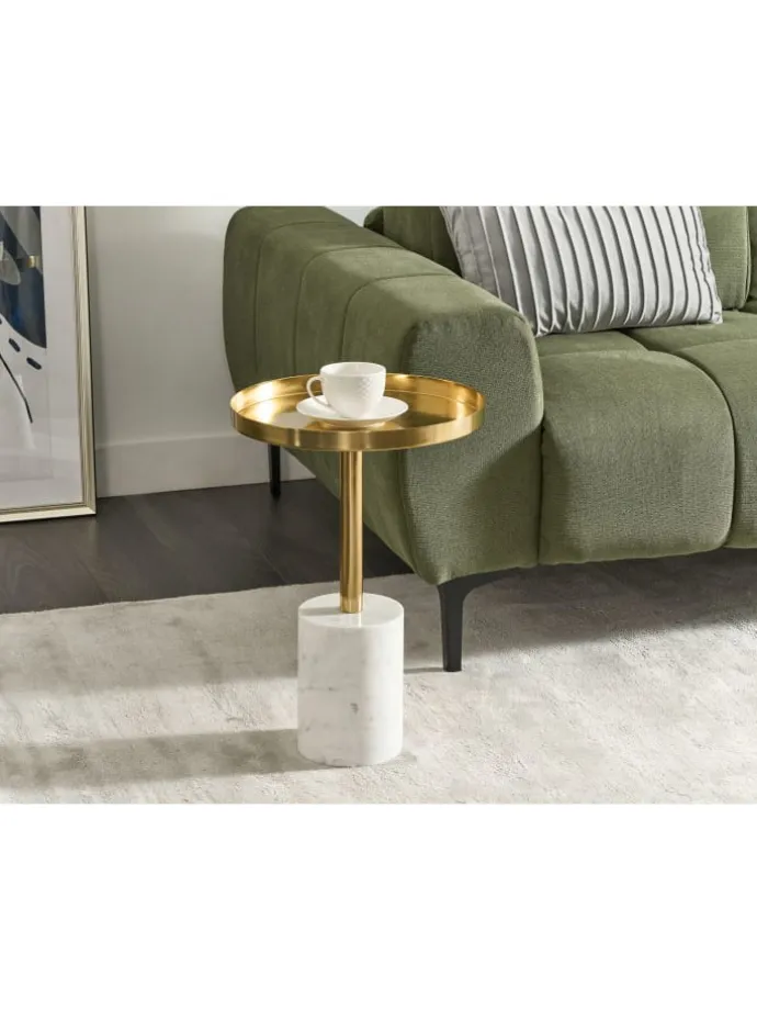 Eleganter Beistelltisch in Gold mit weißem Marmorfuß. Werten Sie Ihr Zuhause mit diesem edlen Beistelltisch auf. Mit der runden, aus Eisen gefertigten Platte in klassischem Gold und einem eleganten Marmorsockel in universellem Weiß strahlt dieser Tisch pure Eleganz aus. Er lässt sich beliebig in verschiedenen Räumen einsetzen, vom Wohnzimmer bis hin zum Flur, und eignet sich perfekt, um Blumen schön in Szene zu setzen oder gemütlich eine Tasse Kaffee abstellen zu können. Verleihen Sie Ihrem Wohnraum mit diesem stilvollen Akzentstück eine glamouröse Note.