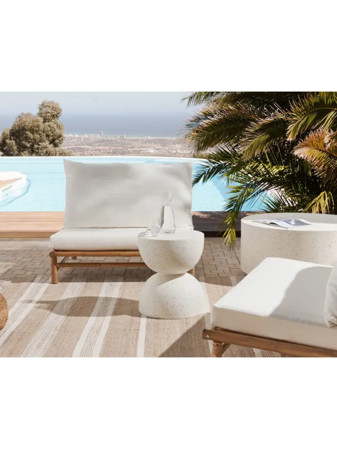 Moderner, cremeweißer Couchtisch aus Beton in trendiger Sanduhrform. Brauchen Sie noch einen robusten, langlebigen, dennoch vielseitigen und modernen Teetisch für Ihren Innen- oder Außenbereich? Dieses Modell liefert Ihnen all das und noch viel mehr. Der Tisch punktet sowohl mit seiner Form, die an eine Sanduhr erinnert als auch mit seiner pflegeleichten Oberfläche, die mit einem Terrazzo-Effekt vollendet ist. Zudem besteht er aus witterungsbeständigen Materialien und ist mit einer UV-beständigen Farbe bemalt. Sein dekoratives Terrazzo-Muster verleiht Ihrer Einrichtung einen trendigen Touch, während sein formschönes Design seinen Charme noch verstärkt.