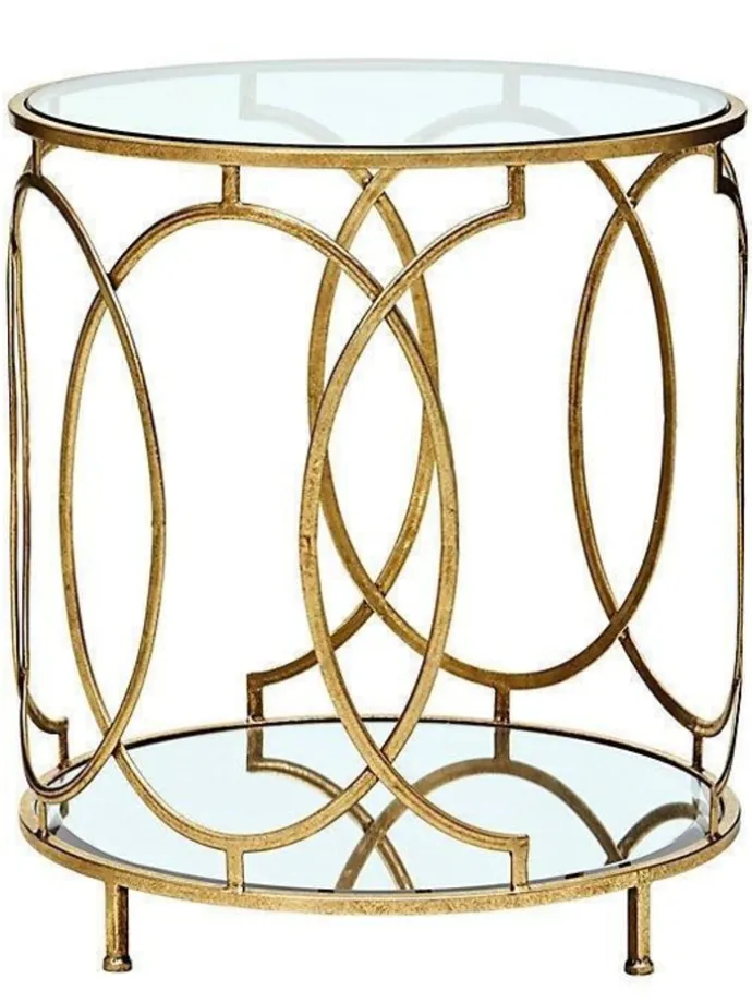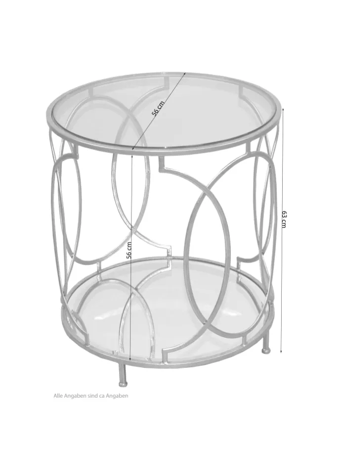 Glastisch mit einem aufwendig gearbeiteten Metallgestell mit reichlicher Verzierung gearbeitet, goldfarben beschichtet und lackiert. Unten eine runde Spiegelglasplatte, oben eine Sicherheits-Klarglasplatte. Dieser schöne große runde Beistelltisch bietet Ihnen viel Platz und sieht sehr edel aus. Artikel wird teilzerlegt angeliefert, einfach nur die Platten ins Gestell einlegen. Maße ca. cm: Durchmesser 56 x Höhe 63 cm. Abstand zwischen den Böden ca. 56 cm. Lieferung nur innerhalb Deutschland möglich.