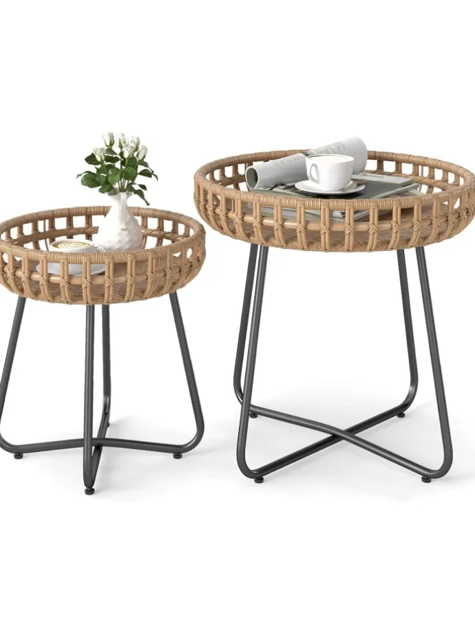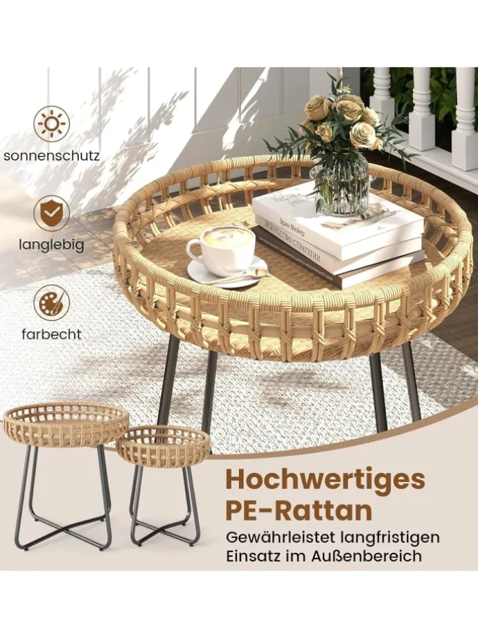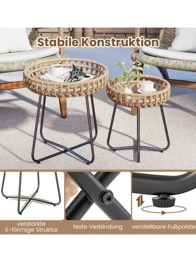 Das handgewebte PE-Rattan, das für diese Beistelltische für den Außenbereich verwendet wird, verleiht Ihrer Außenumgebung eine elegante und natürliche Note und bietet gleichzeitig Sonnenschutz und Langlebigkeit. Diese Metalltische für den Außenbereich verfügen über stabile Beine mit einer X-förmigen Struktur und verstellbaren Fußpolstern, die für hervorragende Stabilität auf verschiedenen Oberflächen sorgen. Mit 2 verschiedenen Größen lassen sich die Couchtische für den Außenbereich flexibel nebeneinander oder separat aufstellen, sodass dieses Set perfekt für Gärten, Balkone, Hinterhöfe oder Innenräume wie Wohn- und Schlafzimmer geeignet ist.