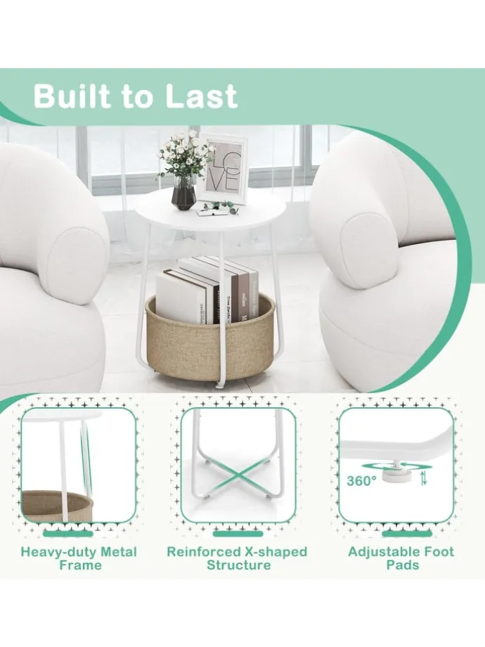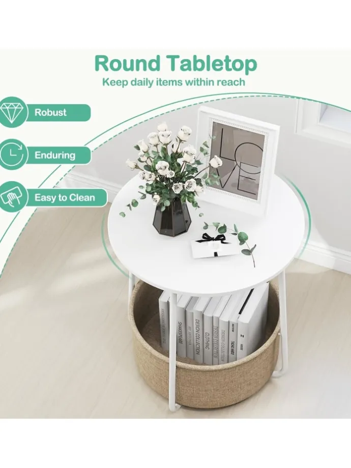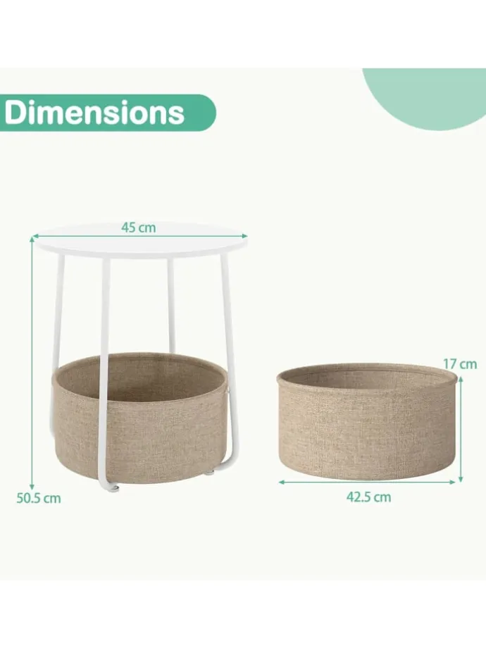Vereinfachen Sie Ihre Aufbewahrung mit diesem vielseitigen Beistelltisch! Ausgestattet mit einer runden Tischplatte und einem abnehmbaren Stoffkorb, bietet der runde Beistelltisch leicht zugänglichen und großzügigen Stauraum für Ihre täglichen Essentials. Für eine zuverlässige Konstruktion ist der Nachttisch aus robustem Metallrahmen und verstellbaren Fußpads gefertigt, die starken Halt und lange Nutzungsdauer gewährleisten.