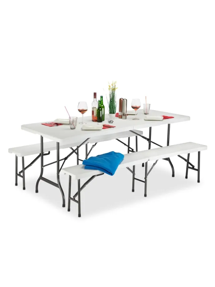Diese Bierzeltgarnitur aus robustem und pflegeleichtem Kunststoff ist die perfekte Festzeltgarnitur, die auf der Festwiese, beim Camping oder im Garten ausreichend Sitzgelegenheiten und Ablageflächen bieten. Das stabile Metallgestell kann zusammengeklappt und platzsparend verstaut werden.